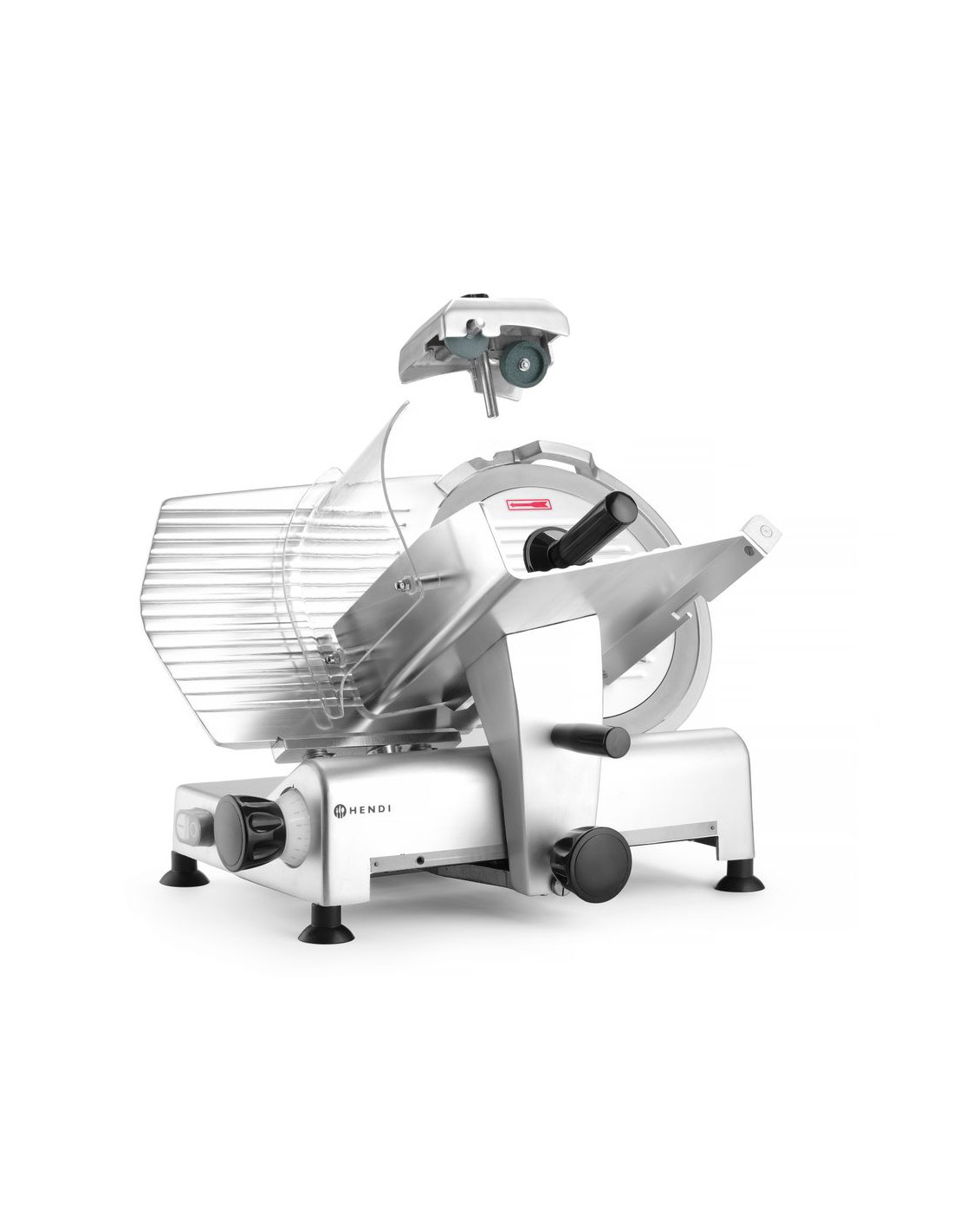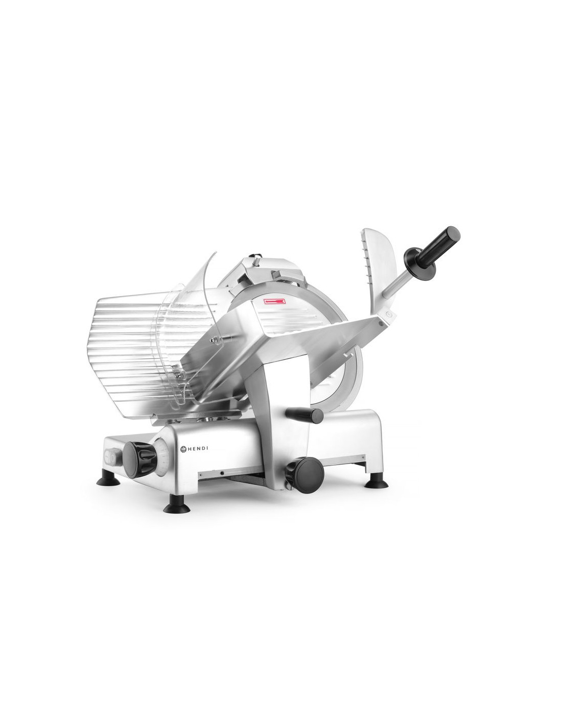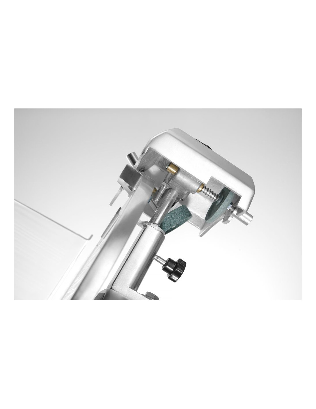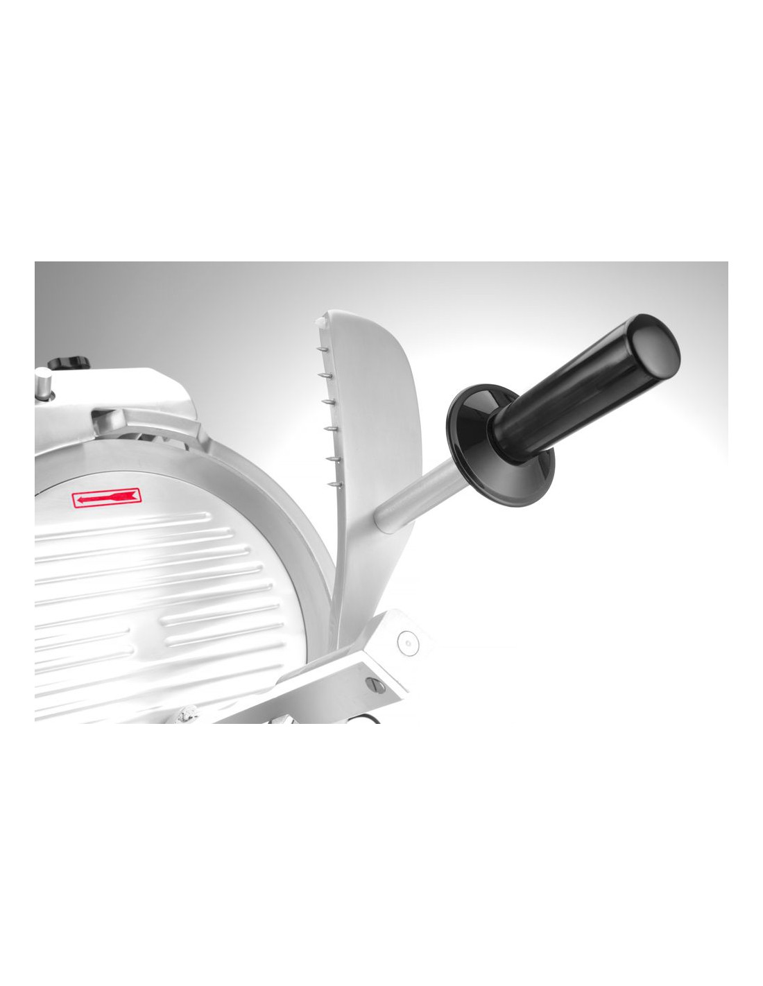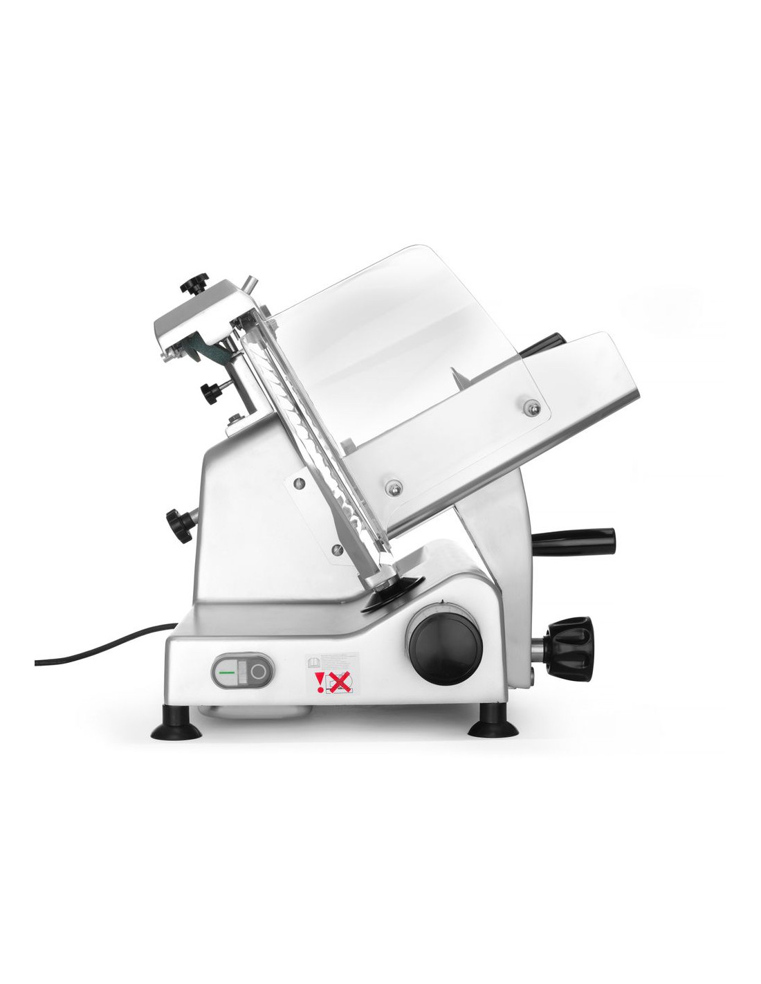 Hölje av belagd aluminium. Härdat rostfritt stålblad, vinklat. Luftkyld motor med överhettningsskydd. Kraftfull motor för att skära tufft kött. Utrustad med bladskydd och inbyggd slipmaskin. Vagn med säkerhetsskydd, klämelement och vertikal låsanordning. Snabb och enkel demontering för enkel rengöring. Uppfyller alla säkerhetskrav för utrustning för professionellt bruk, dvs: – genom att ställa in vredet på "0" skärtjocklek håller bladet sig bakom skyddet. – skydd mot oönskad start om slipmaskinen eller bladskyddet tas bort. – möjlighet att låsa och ta bort vagnen endast med bladet inställt i "0" skärtjockleksläge. Ej lämplig för att skära ost. Ostskivning möjlig med en separat tillgänglig non-stick kniv.