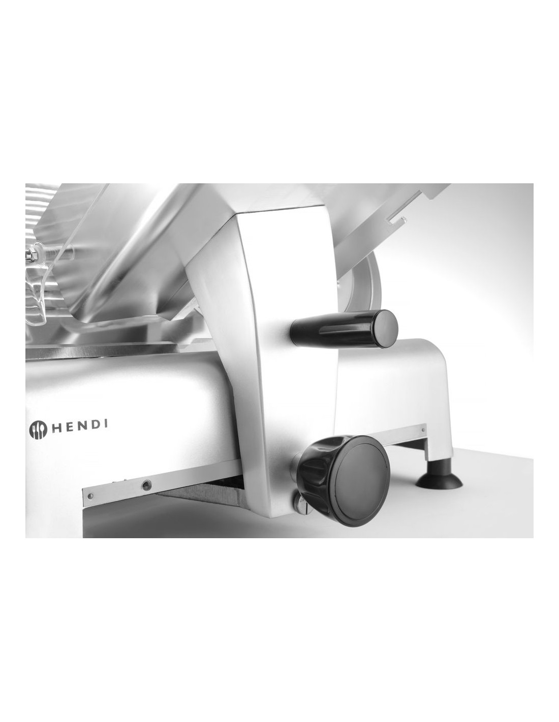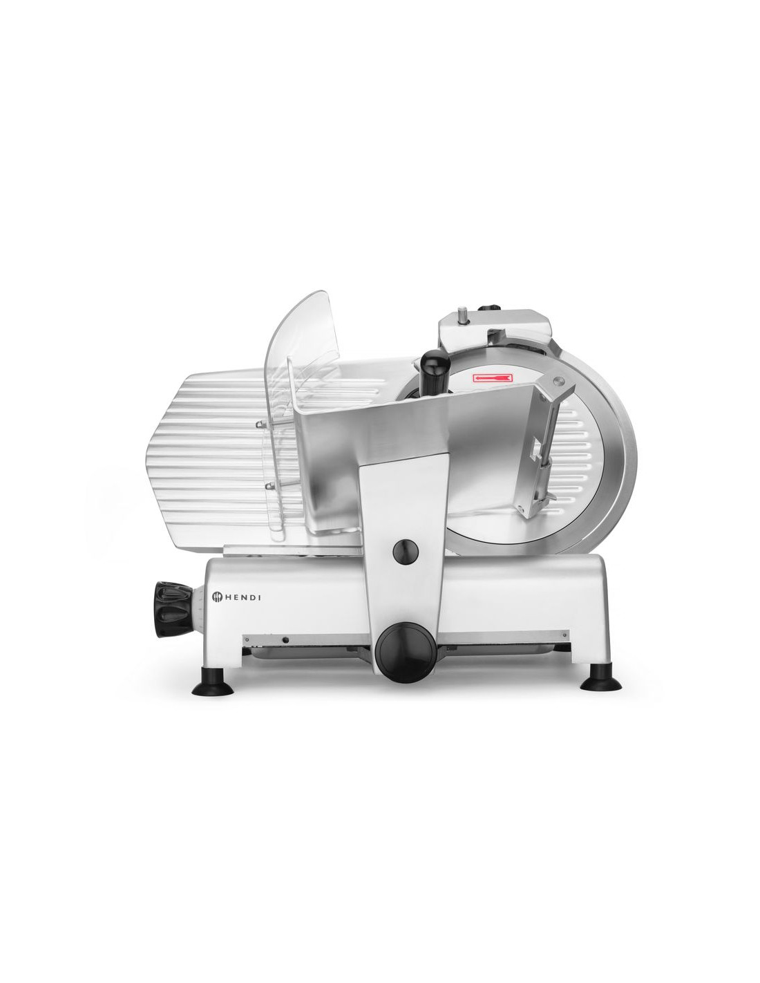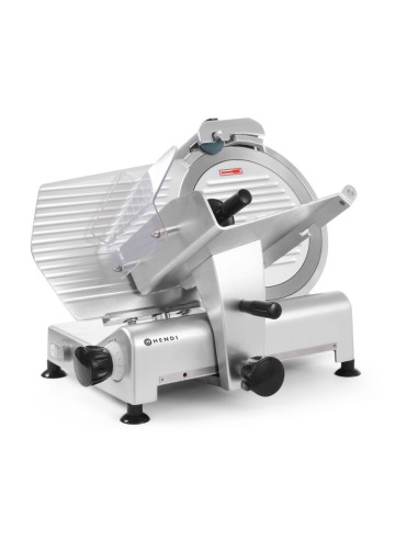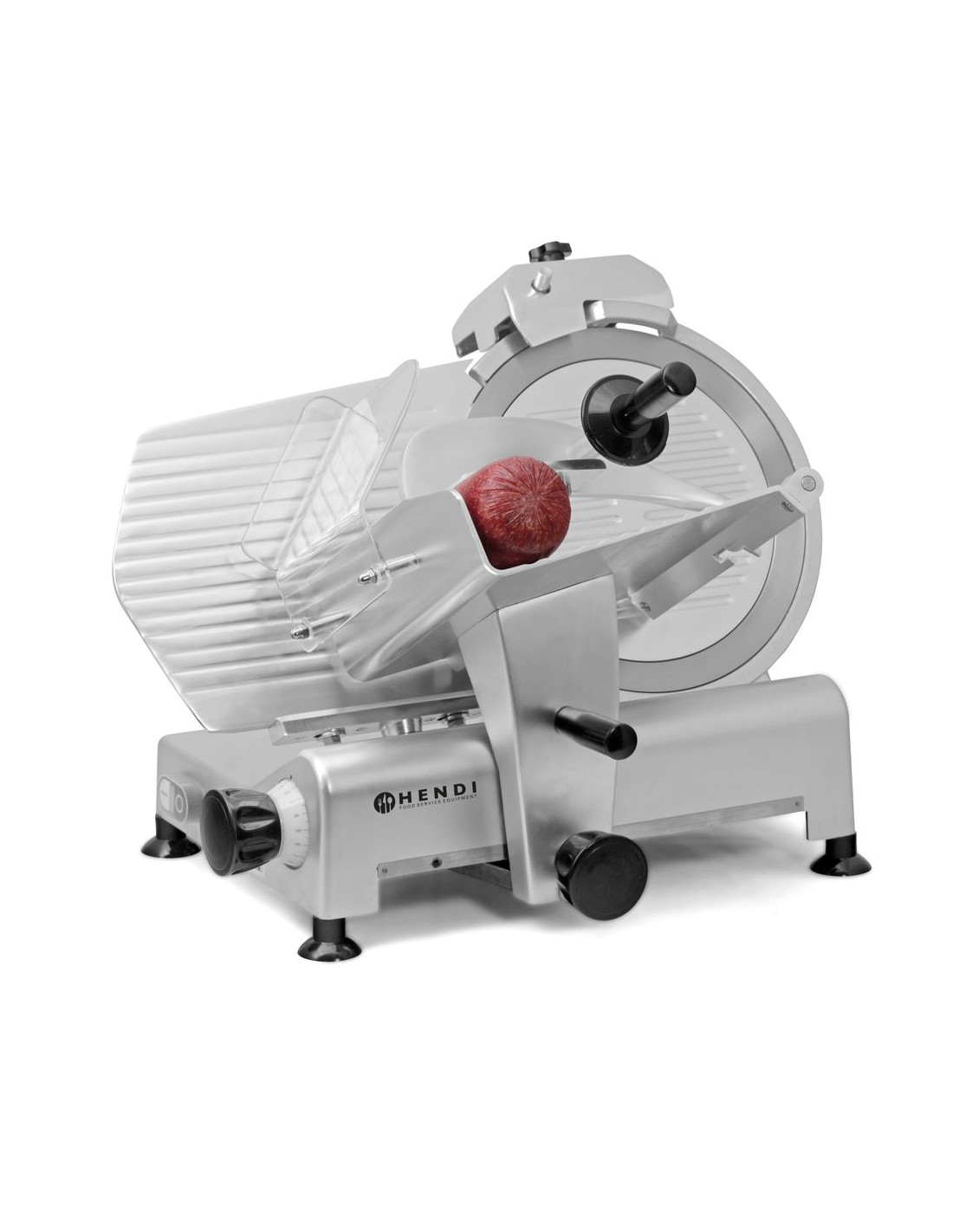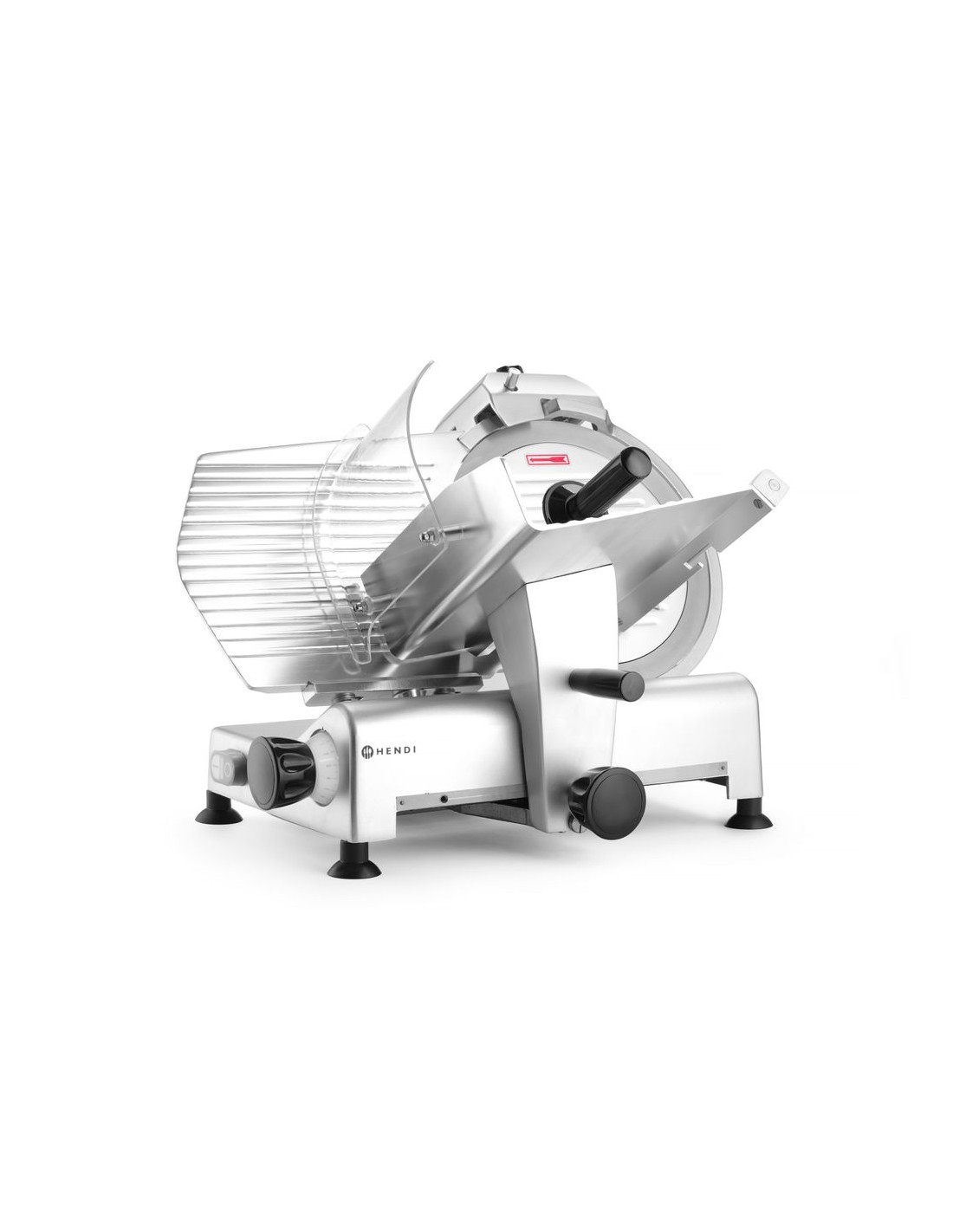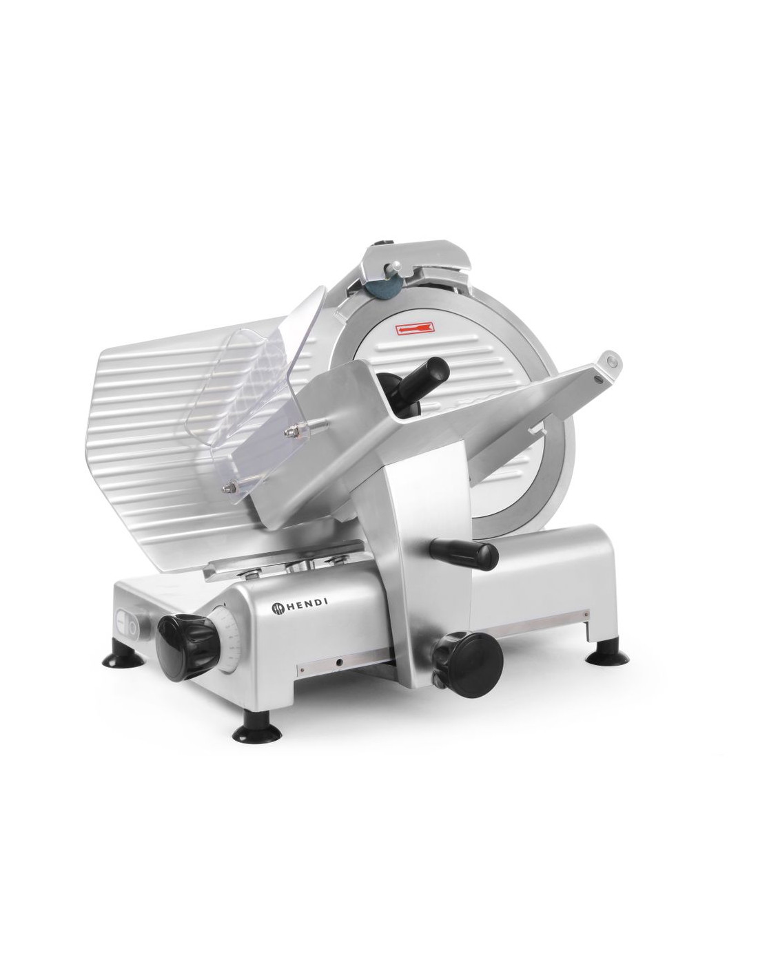 Hölje av belagd aluminium. Härdat rostfritt stålblad, vinklat. Luftkyld motor med överhettningsskydd. Kraftfull motor för att skära tufft kött. Utrustad med bladskydd och inbyggd slipmaskin. Vagn med säkerhetsskydd, klämelement och vertikal låsanordning. Snabb och enkel demontering för enkel rengöring. Uppfyller alla säkerhetskrav för utrustning för professionellt bruk, dvs: – genom att ställa in vredet på "0" skärtjocklek håller bladet sig bakom skyddet. – skydd mot oönskad start om slipmaskinen eller bladskyddet tas bort. – möjlighet att låsa och ta bort vagnen endast med bladet inställt i "0" skärtjockleksläge. Ej lämplig för att skära ost. Ostskivning möjlig med en separat tillgänglig non-stick kniv.