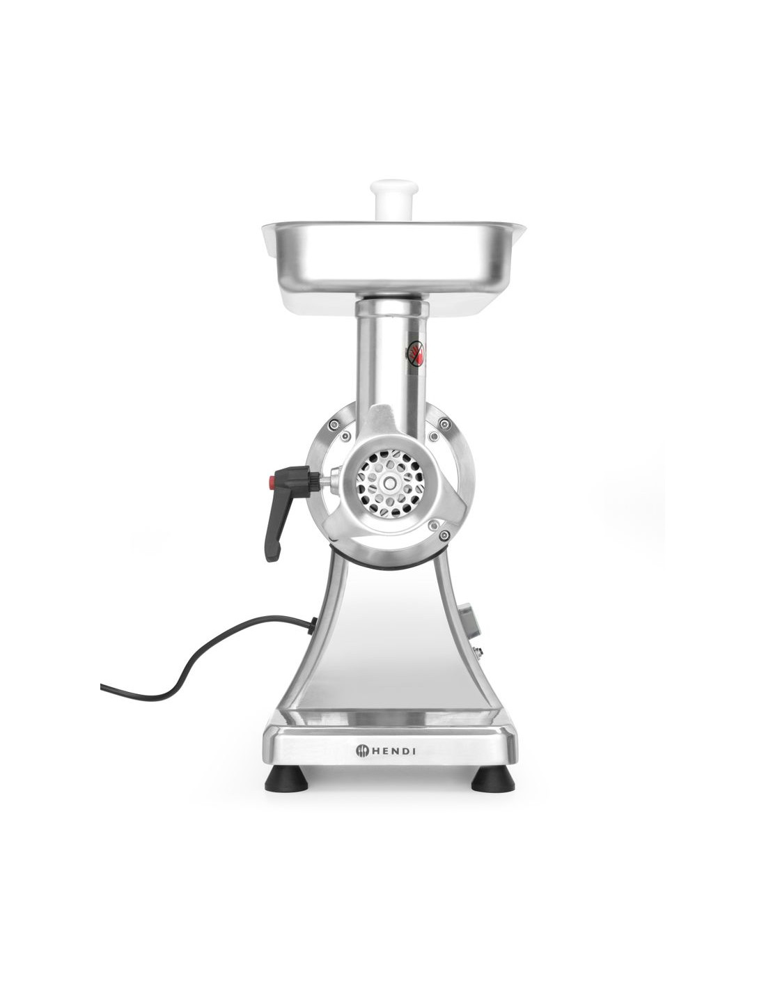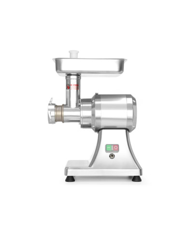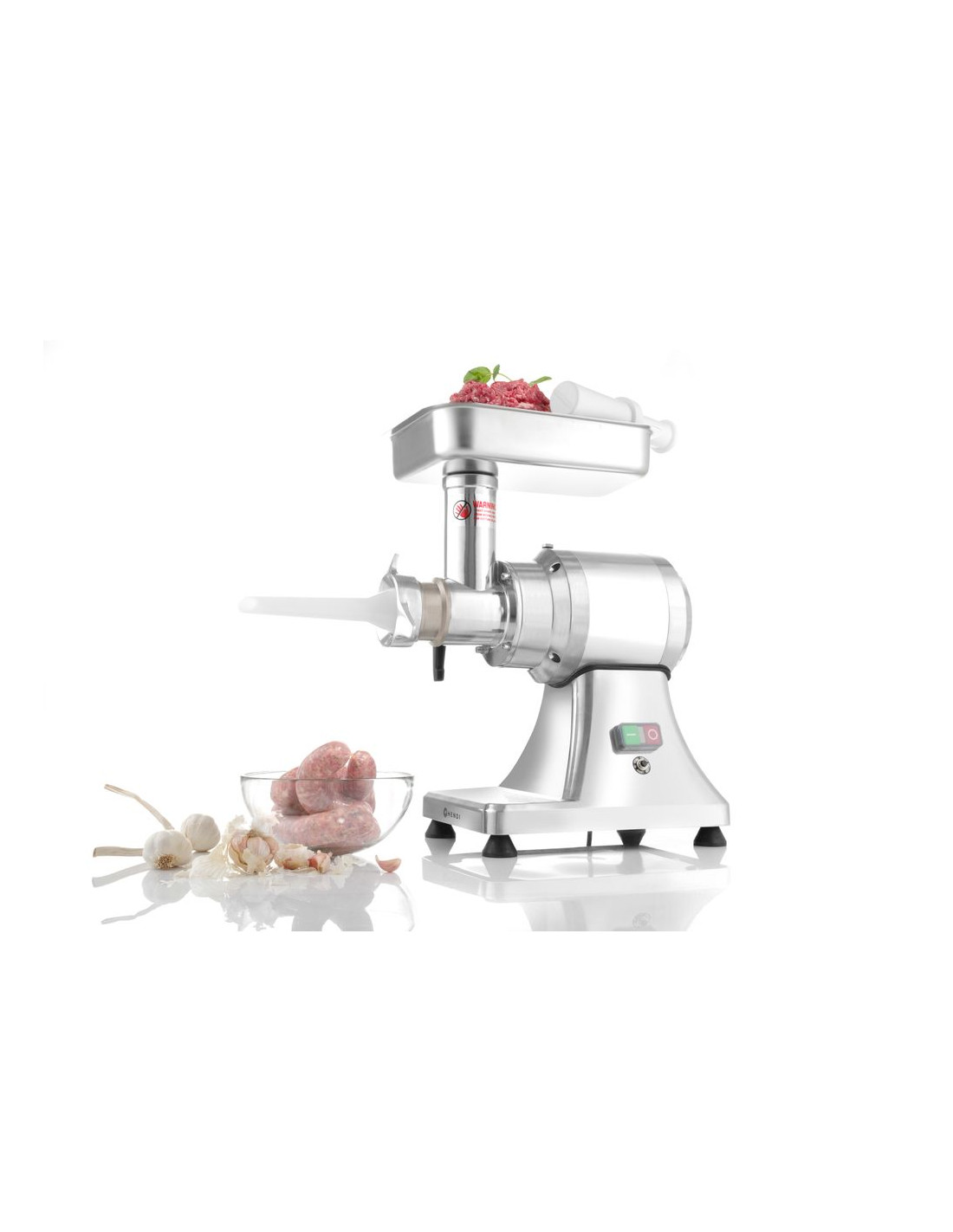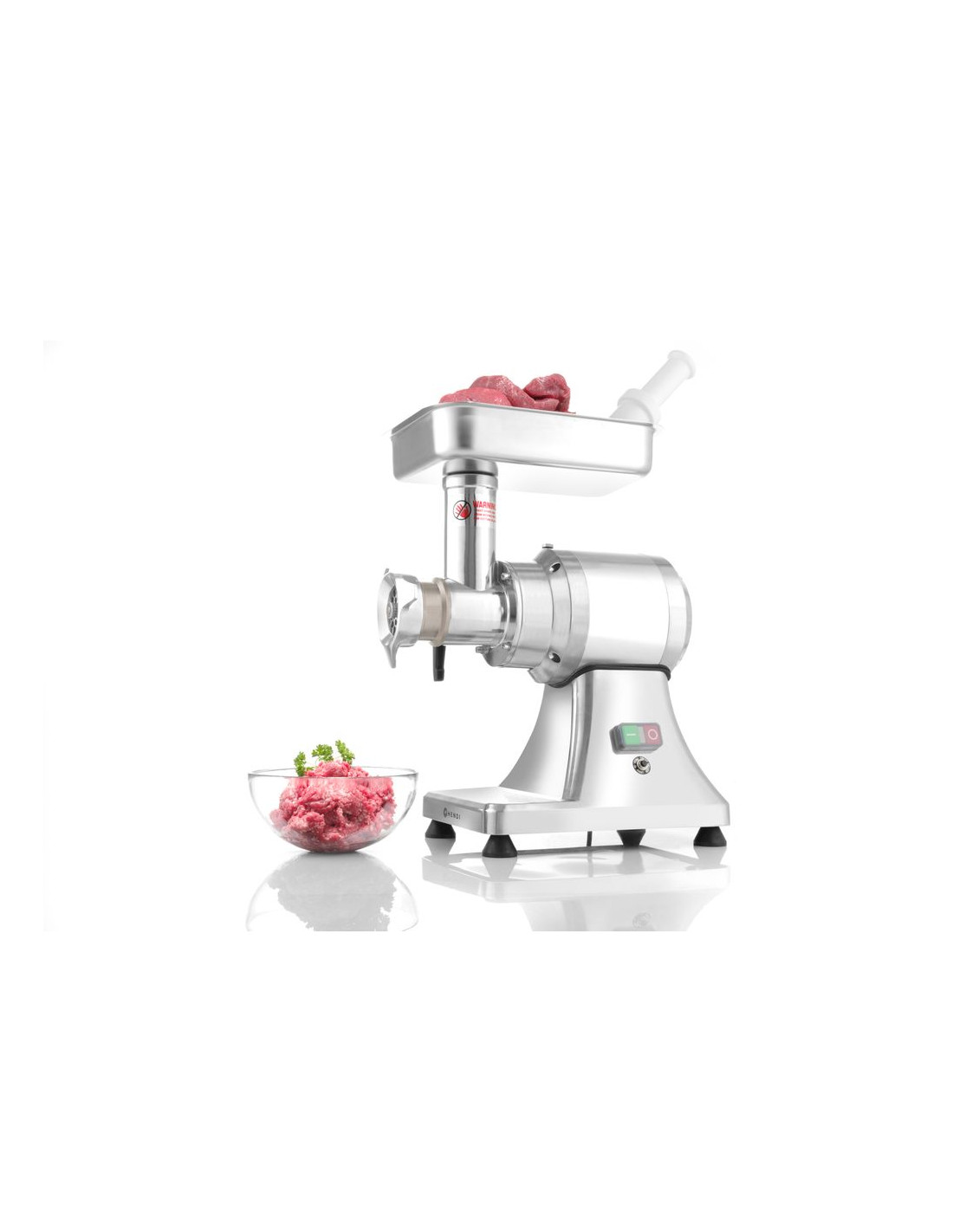 Matarbricka i rostfritt stål, tratt tillverkad av en speciell aluminiumlegering. Kniv och snäckskruv tillverkade av rostfritt stål och tratt av gjutjärn. Fyllningsrör och två Ø 70 mm hackskivor med Ø 6 och 8 mm hål ingår. Enkel demontering för enkel rengöring. Motor med överhettningsskydd. Halkfria fötter. Effekt ≤ 1,7 kg/min. Ej för kontinuerlig användning.