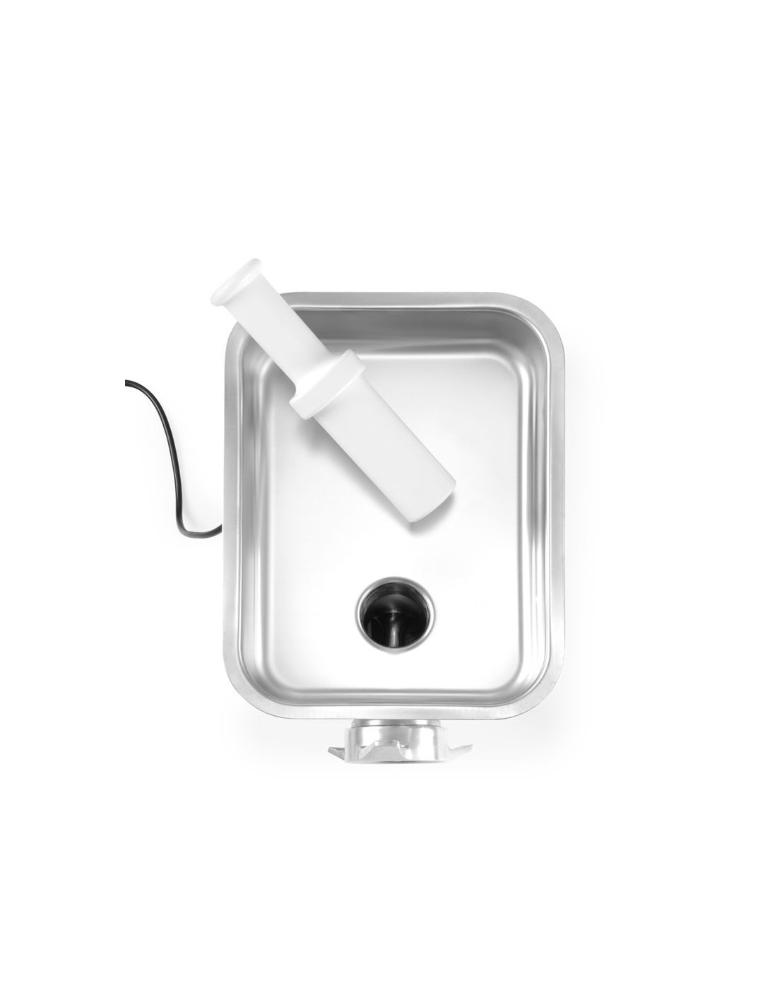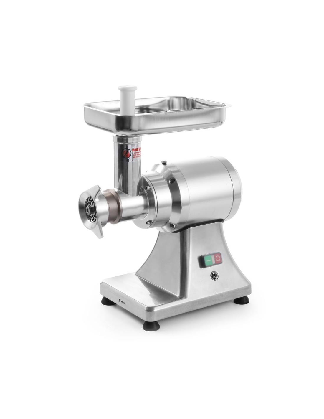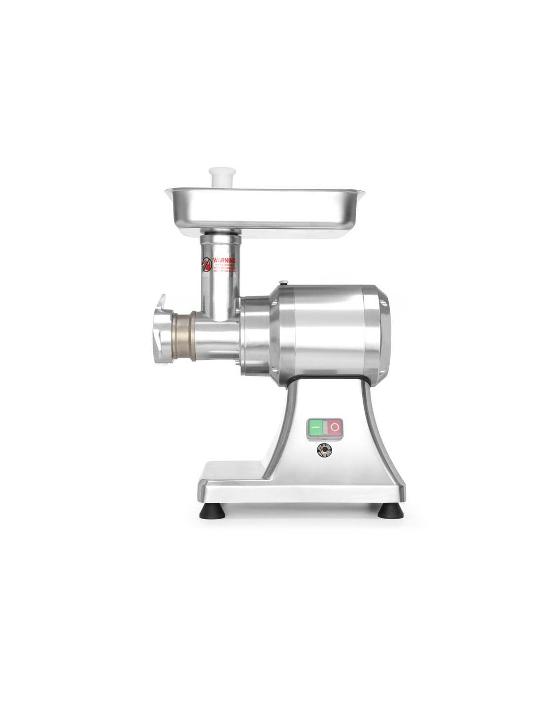 Matarbricka i rostfritt stål, tratt tillverkad av en speciell aluminiumlegering. Kniv och snäckskruv tillverkade av rostfritt stål och tratt av gjutjärn. Fyllningsrör och två Ø 70 mm hackskivor med Ø 6 och 8 mm hål ingår. Enkel demontering för enkel rengöring. Motor med överhettningsskydd. Halkfria fötter. Effekt ≤ 1,7 kg/min. Ej för kontinuerlig användning.