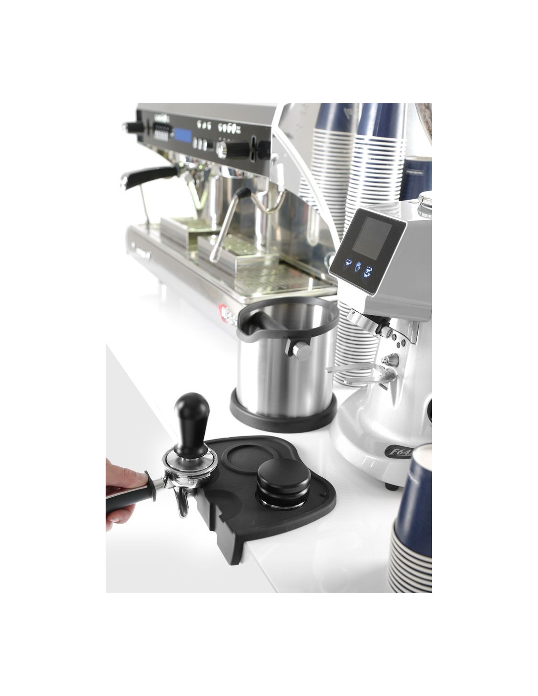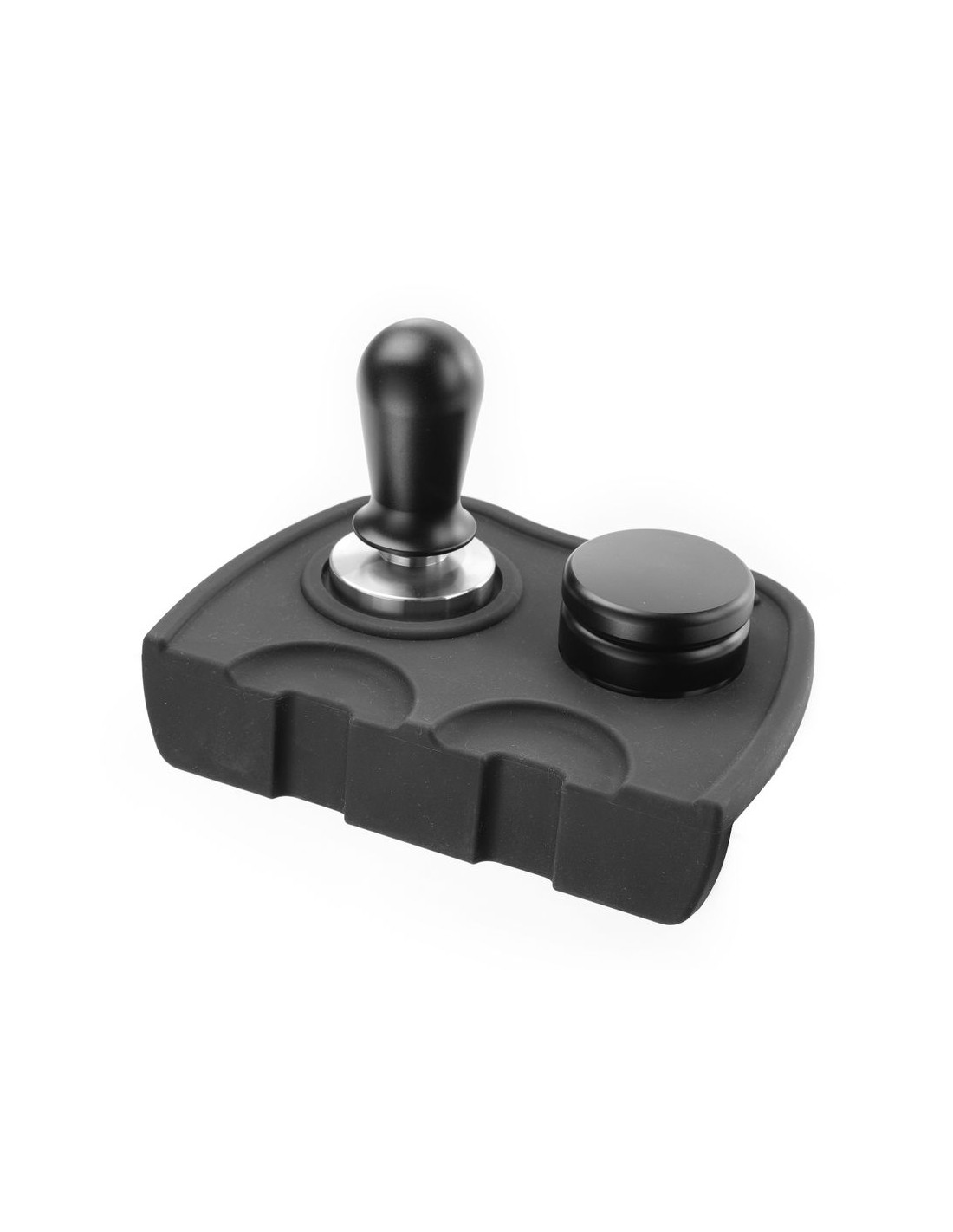 Tillverkad av silikon, med urtag för att placera 2 portafilter under stampning. Med två hål för att placera stamparna i.