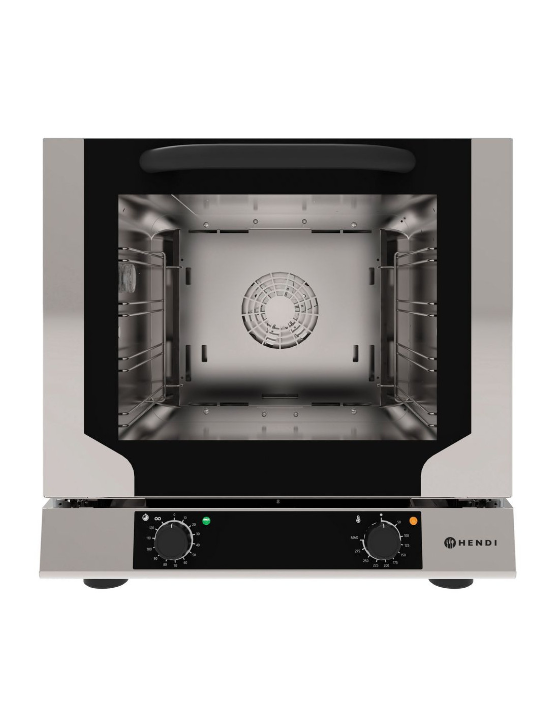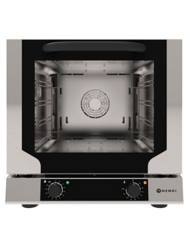 Hölje och kammare tillverkade av 18/8 rostfritt stål. Glasdörren är sval vid beröring tack vare 2 lager glas med gravitationsventilation emellan, gångjärn i botten. Passar 4 brickor 429x345 mm, ingår i setet, tillverkade av aluminium. Temperaturen kan ställas in från 100°C till 260°C. Utrustad med överhettningsskydd. Brickstöden är placerade med 74 mm mellanrum. Vattentäthetsklass IPX3.