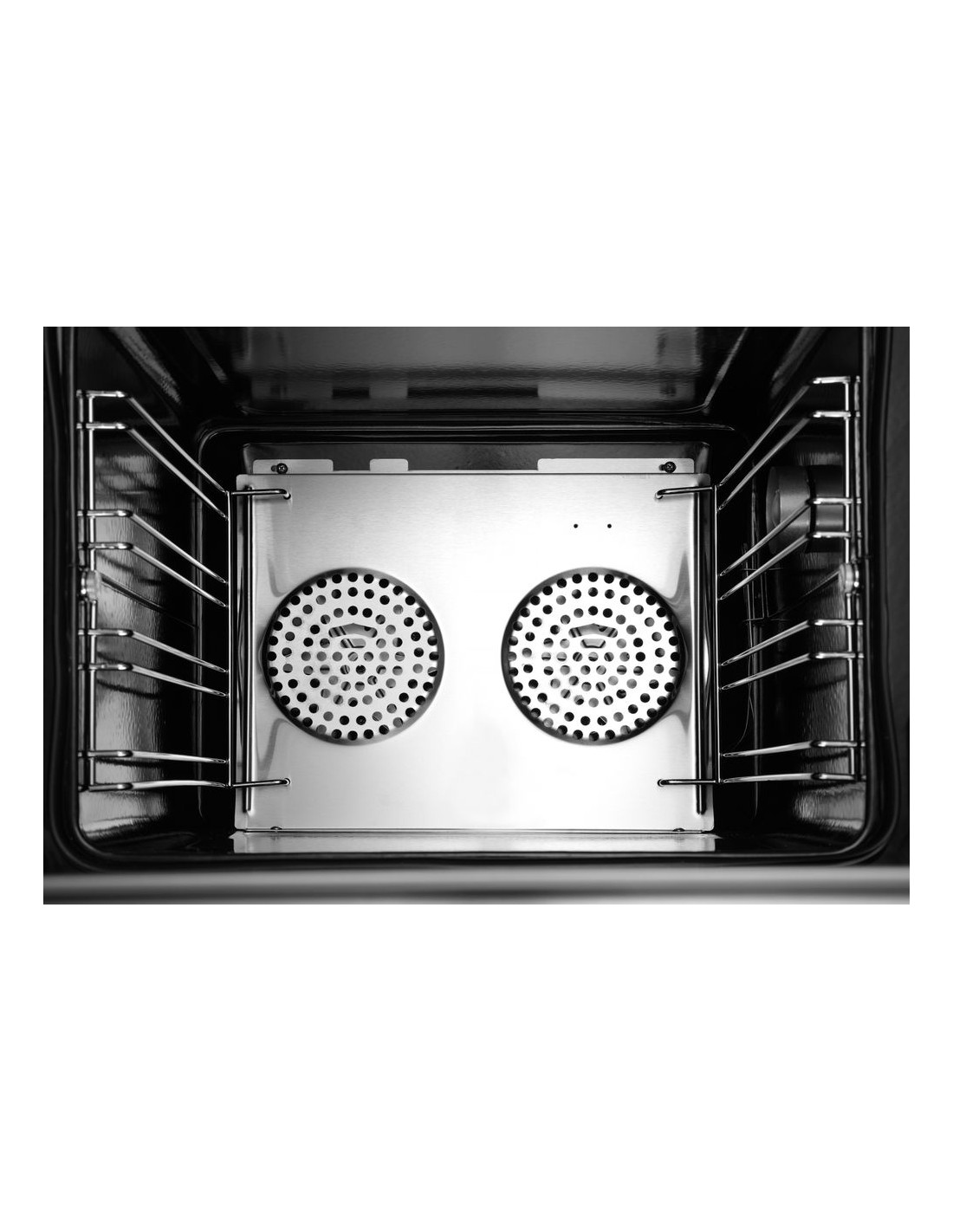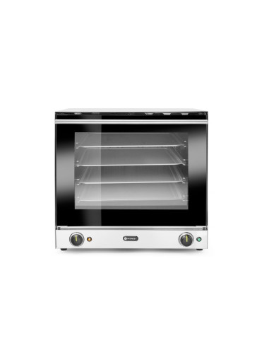 Hölje av rostfritt stål. Dörr med svalt utseende och dubbelglas, som kan tas bort för enkel rengöring. Delvis emaljerad ugnskammare med innerbelysning. Uppvärmning med hjälp av 2 värmeelement och 2 fläktar. Temperaturjusterbar från 50 °C till 300 °C. Timer: 0-120 min. Passar 4 stycken 437 x 314 mm brickor. Skenornas mellanrum: 70 mm. Levereras med 4 brickor. Stativ: 223468.