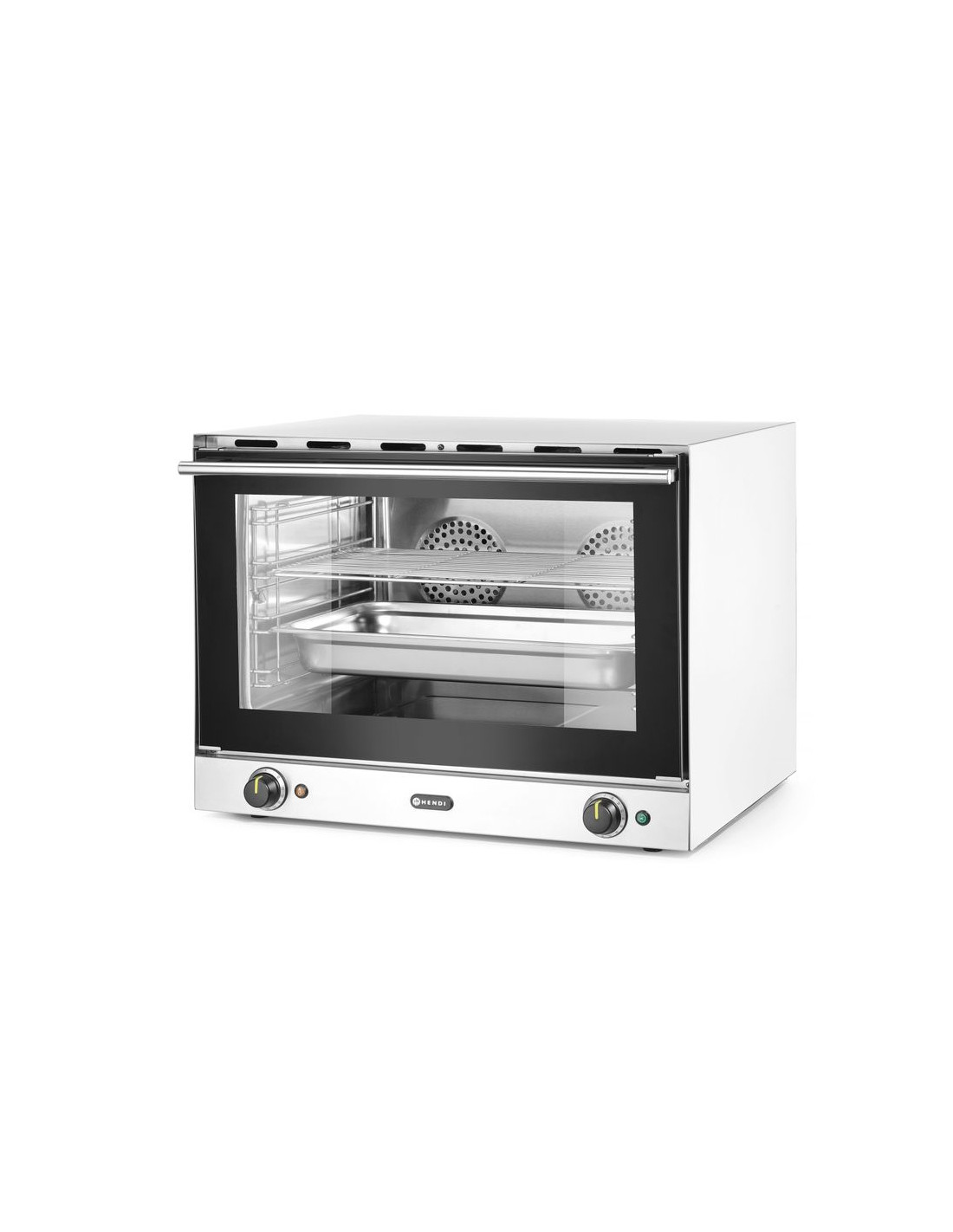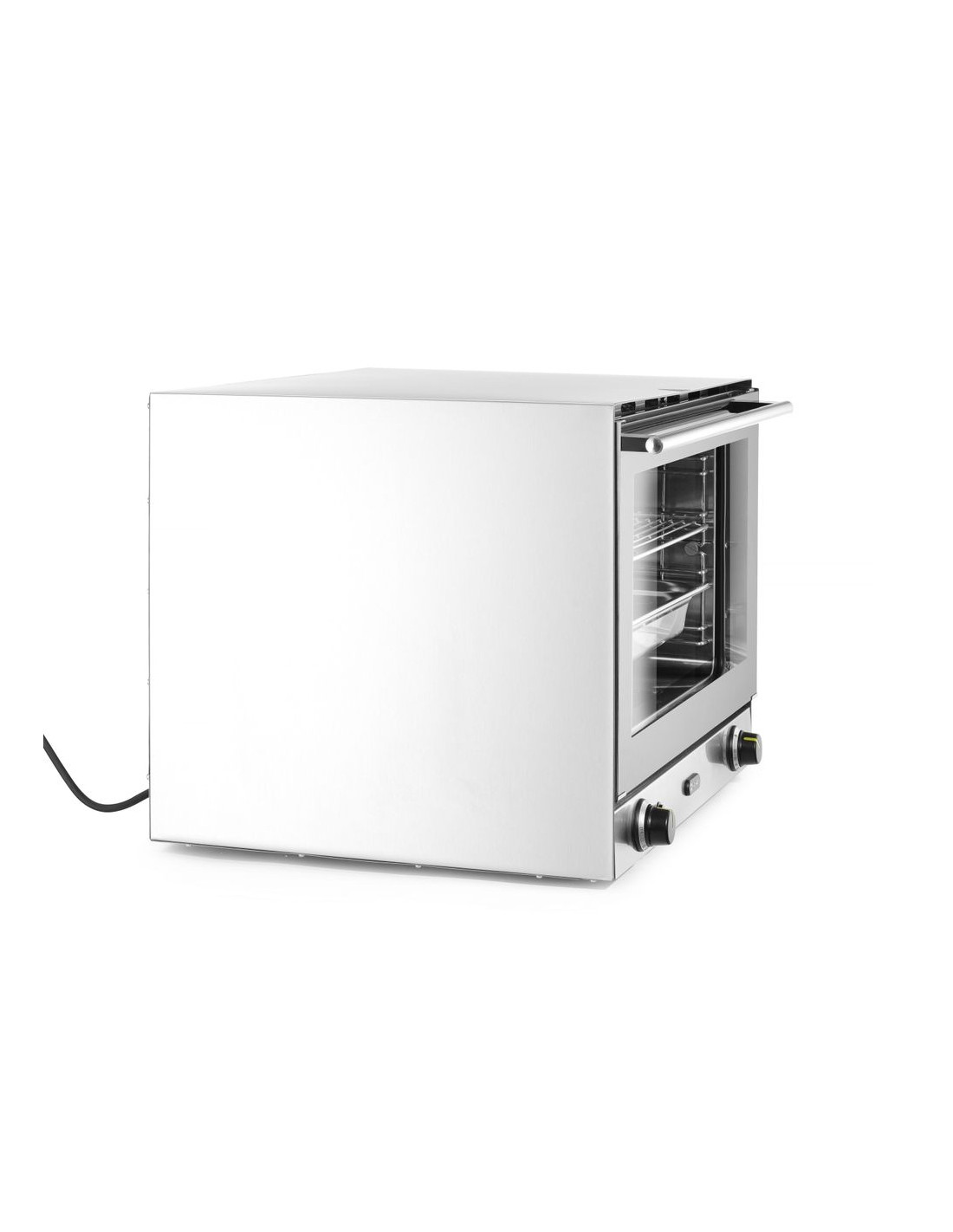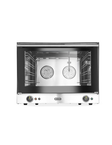 Hölje i rostfritt stål. Avtagbar, cool touch-dörr med dubbelglas. Delvis emaljerad ugnsutrymme med innerbelysning. Uppvärmning med hjälp av 2 värmeelement och 2 fläktar. Temperatur justerbar från 50 °C till 300 °C. Timer: 0-120 min. Passar 4x GN 1/1-plåtar. Skenavstånd: 75 mm. Levereras med GN 1/1-plåt 65 mm och GN 1/1-galler.