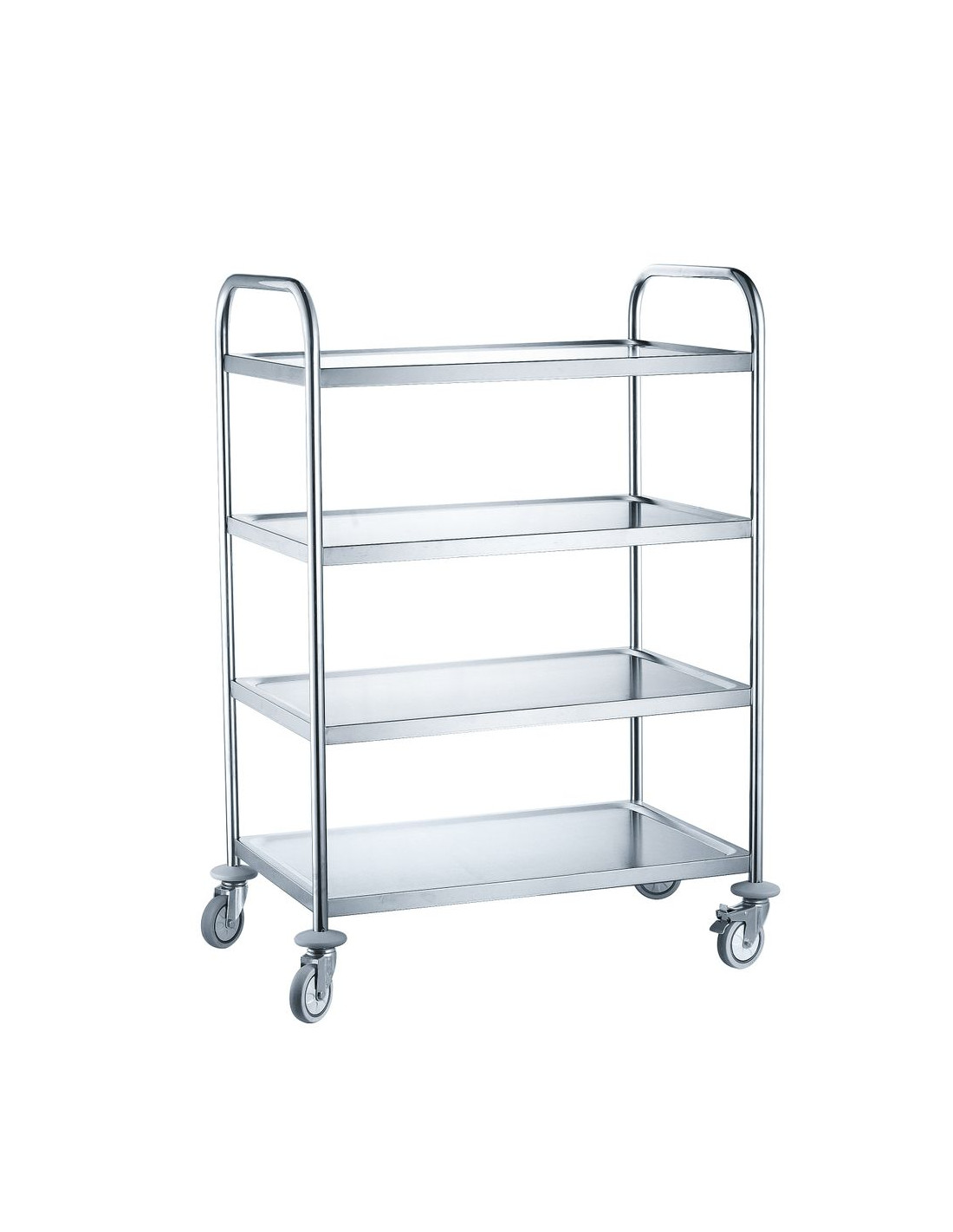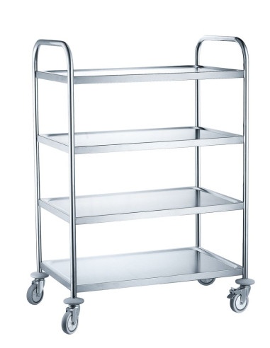 Tillverkad av rostfritt stål. Utrustad med 4 hyllplan. Inkluderar 4 hjul, varav 2 med broms, utrustade med hörnskydd. Leverans i platt förpackning.