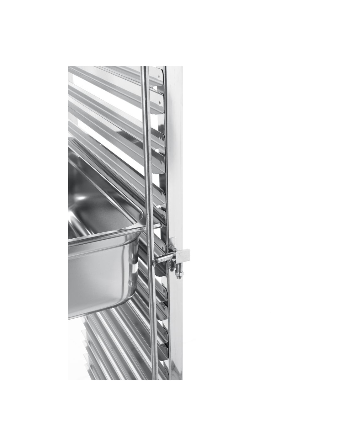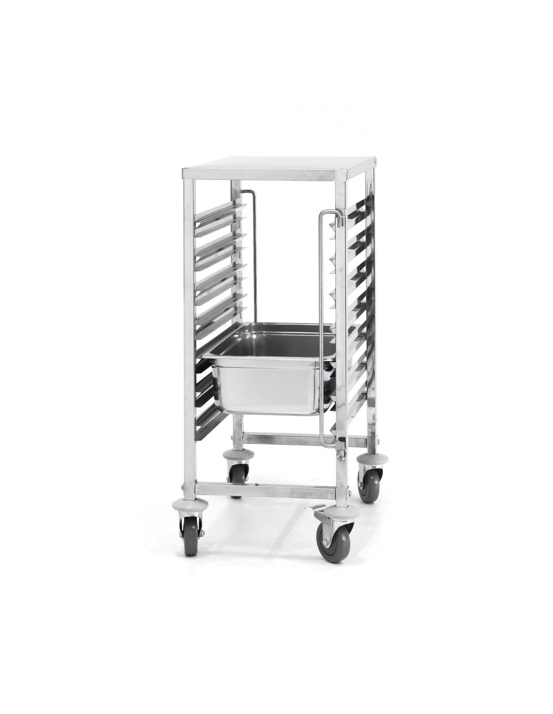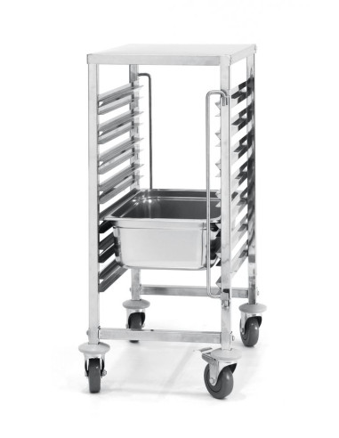 Utformad för att passa GN 1/1-brickor/behållare - med 80 mm mellanrum. Med arbetsyta. Bricklås på båda sidor. Utrustad med fyra hjul varav två med broms. GN 1/1 - 530x325. Tillåten belastning på vagnen 70 kg vid jämnt fördelad vikt. Leverans i platta förpackningar.