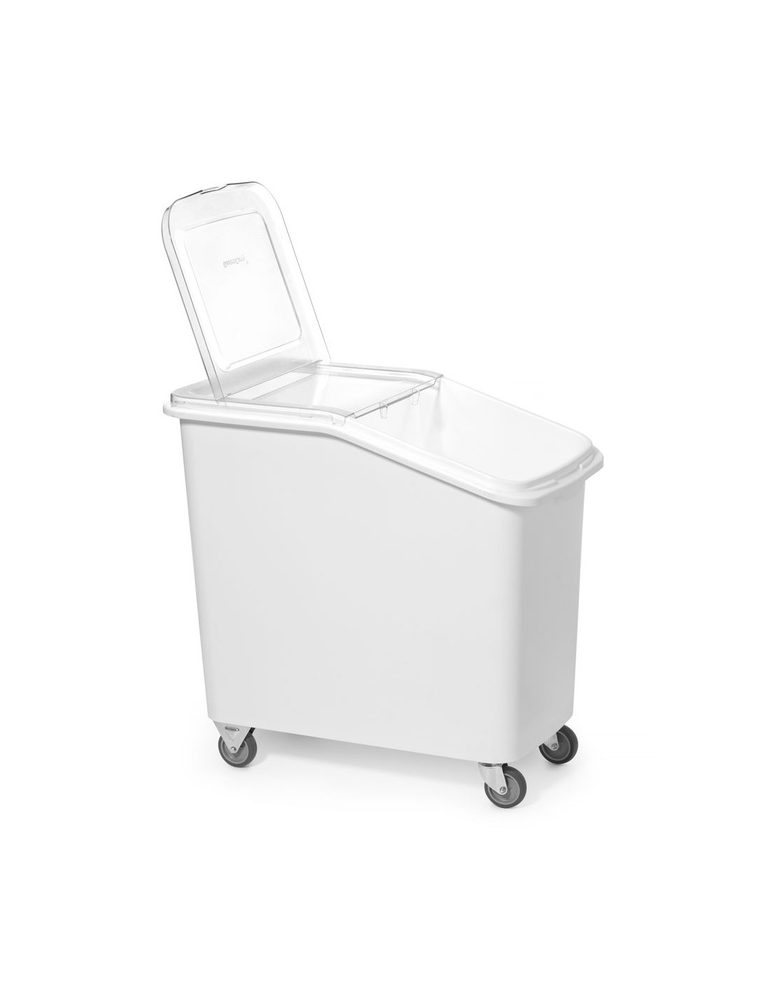 Tillverkad av polypropen. Lock av polykarbonat. Rundade hörn och släta innerväggar. Skenor placerade i den övre, inre delen av vagnen för montering av skopan. 4 breda gummihjul 75 mm, inklusive 2 länkhjul med bromsar för enklare transport.