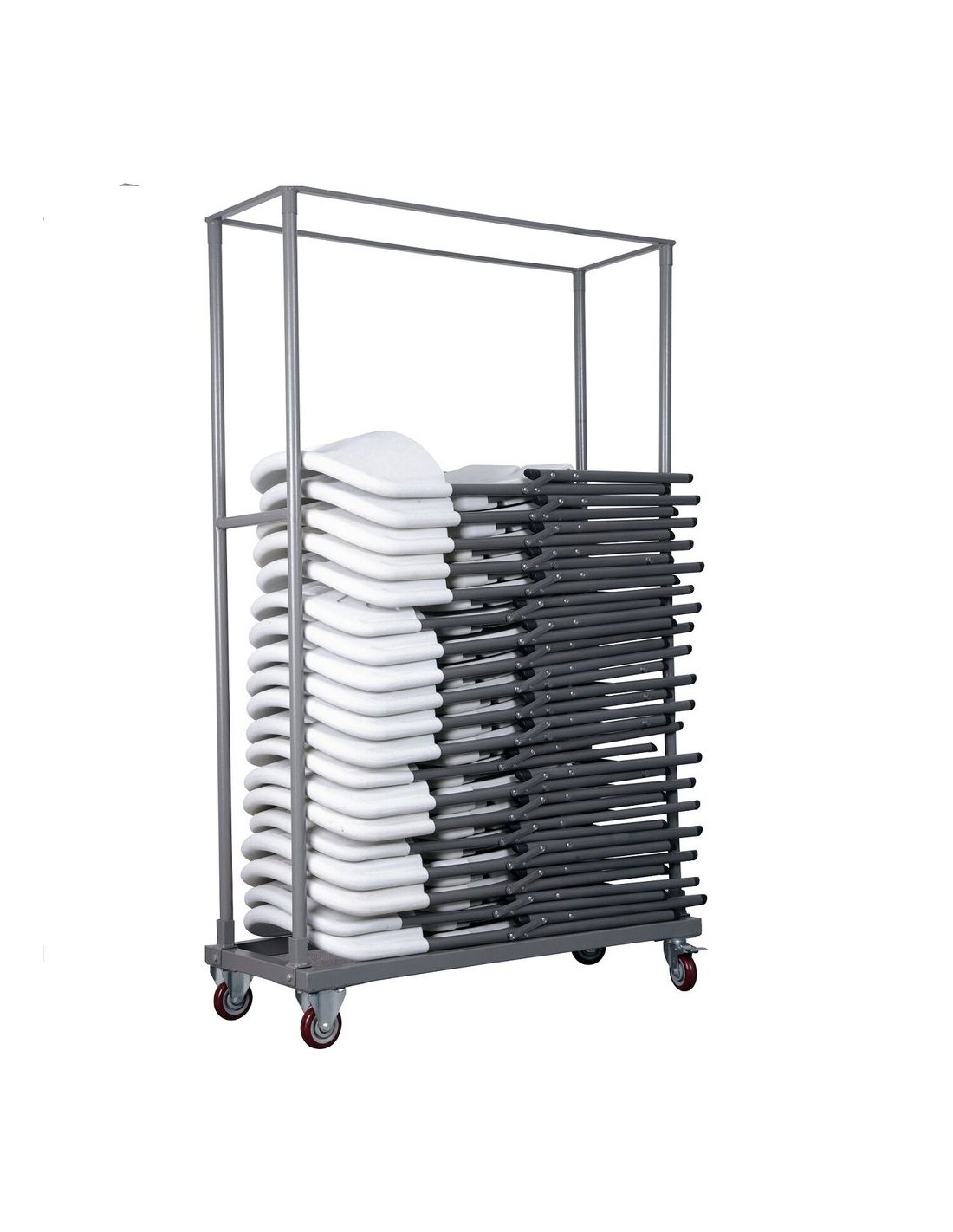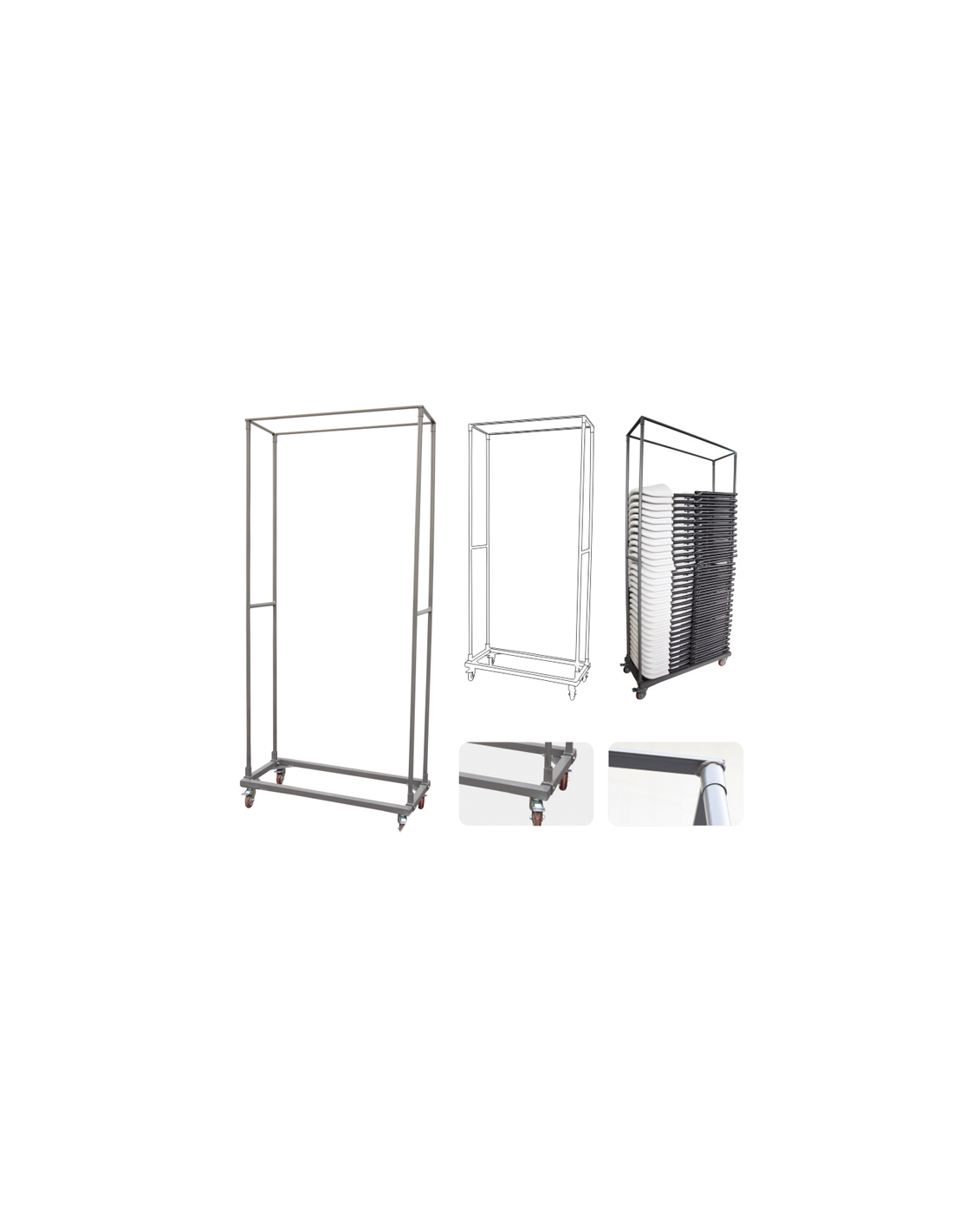 Hölje av pulverlackerat kolstål. 2 fasta och 2 svängbara hjul med bromsar. För transport, förvaring och skydd av stolar. Lastning av upp till 25 stolar.