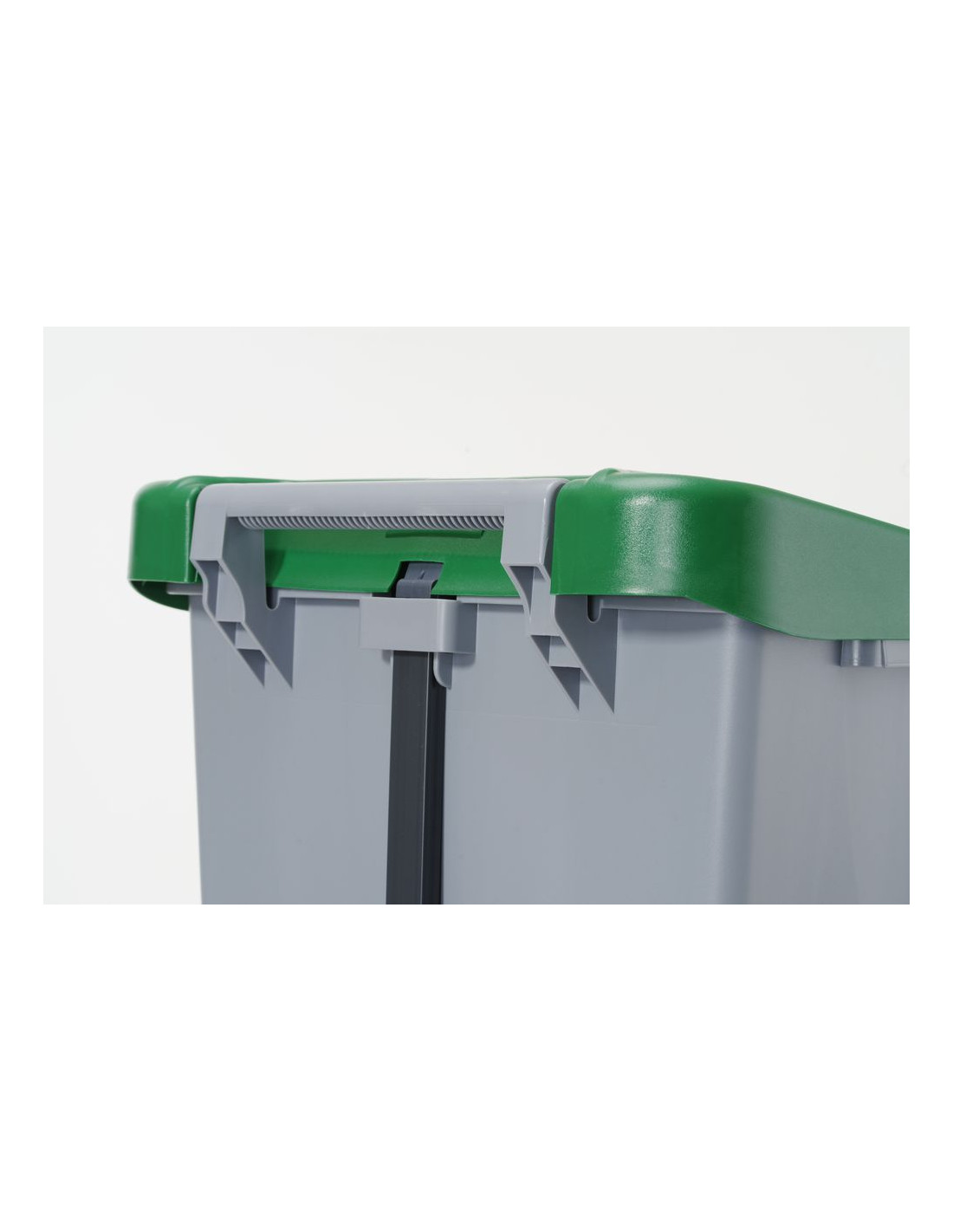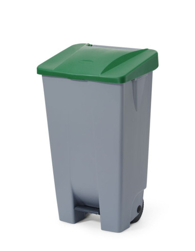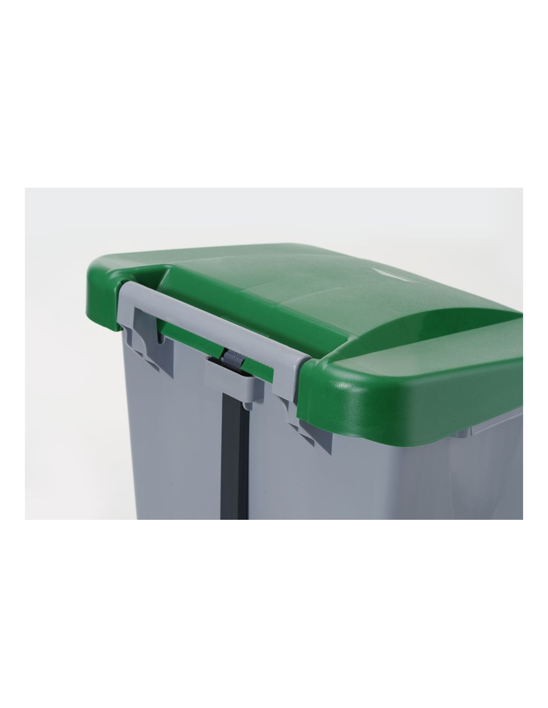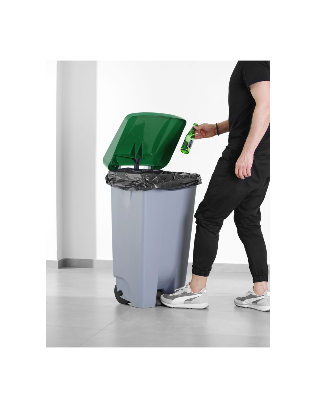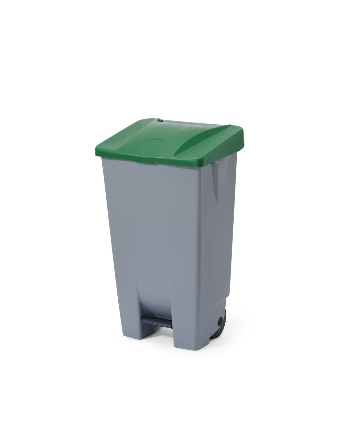 Tillverkad av polypropen. Pedalmanövrerad. Inkluderar handtag och hjul. Lock säljs separat i 6 färger.