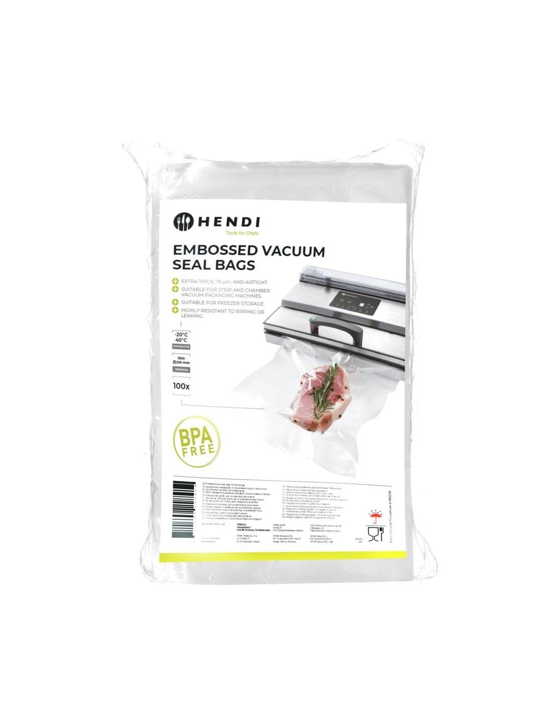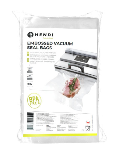 HENDI präglade vakuumförseglingspåsar fungerar smidigt med både strip- och kammarvakuummaskiner. De är idealiska för att hålla mat färsk längre. Det präglade mönstret optimerar vakuumförseglingen. Dessa påsar är endast avsedda för förvaring av livsmedel.