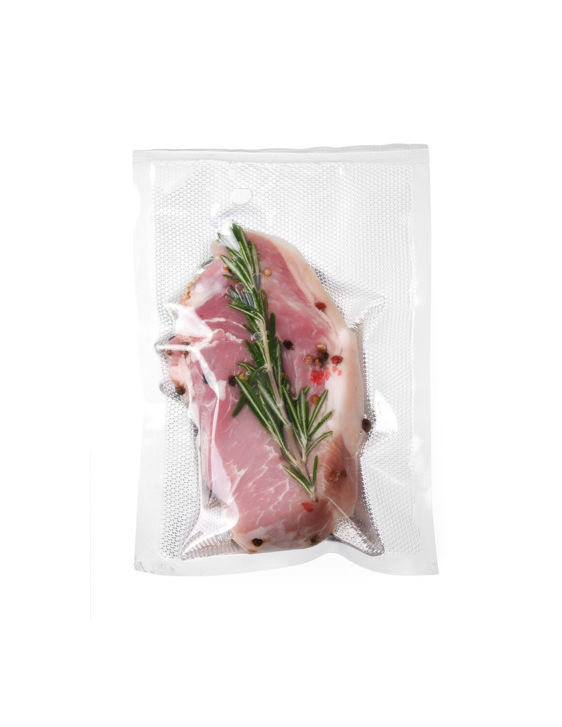 Tillverkad av polyamid (innerlager) och polyeten (ytterlager). Räfflad – med prägling som underlättar luftutsugning och vakuumproduktion. BPA-fri. Avsedd endast för matförvaring, inte för sous vide-tillagning. Temperaturbeständighet: från -20 °C till 40 °C. Tjocklek: 75 µm. Svetsad på 3 sidor. Antal: 100 st.