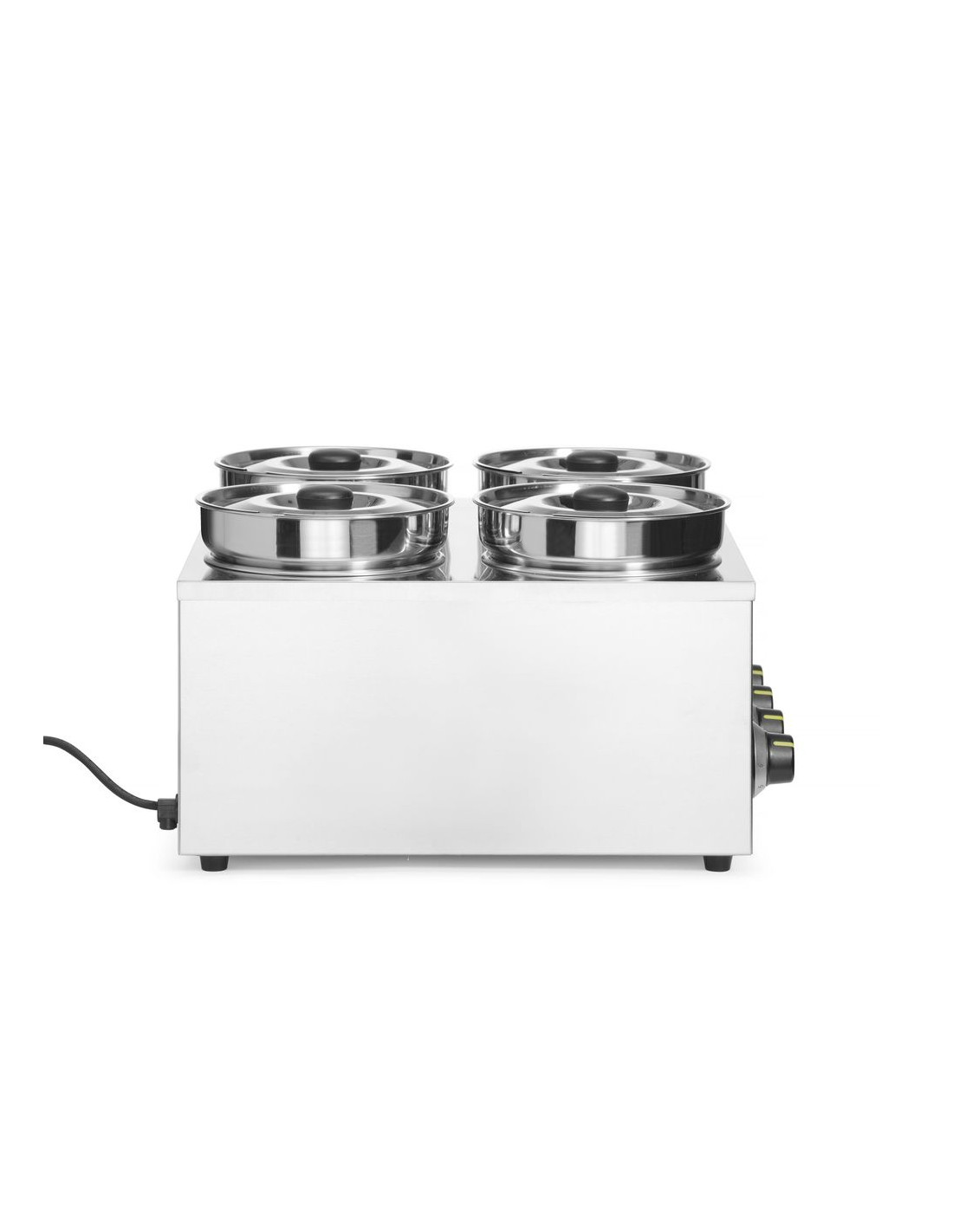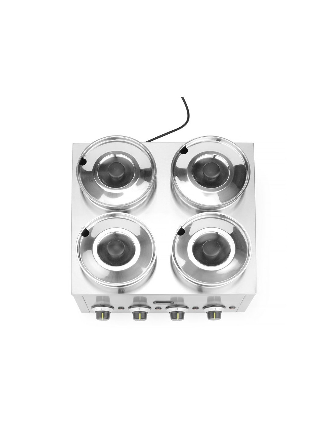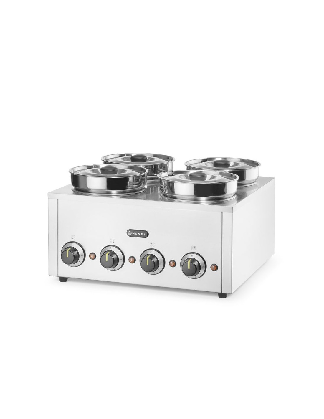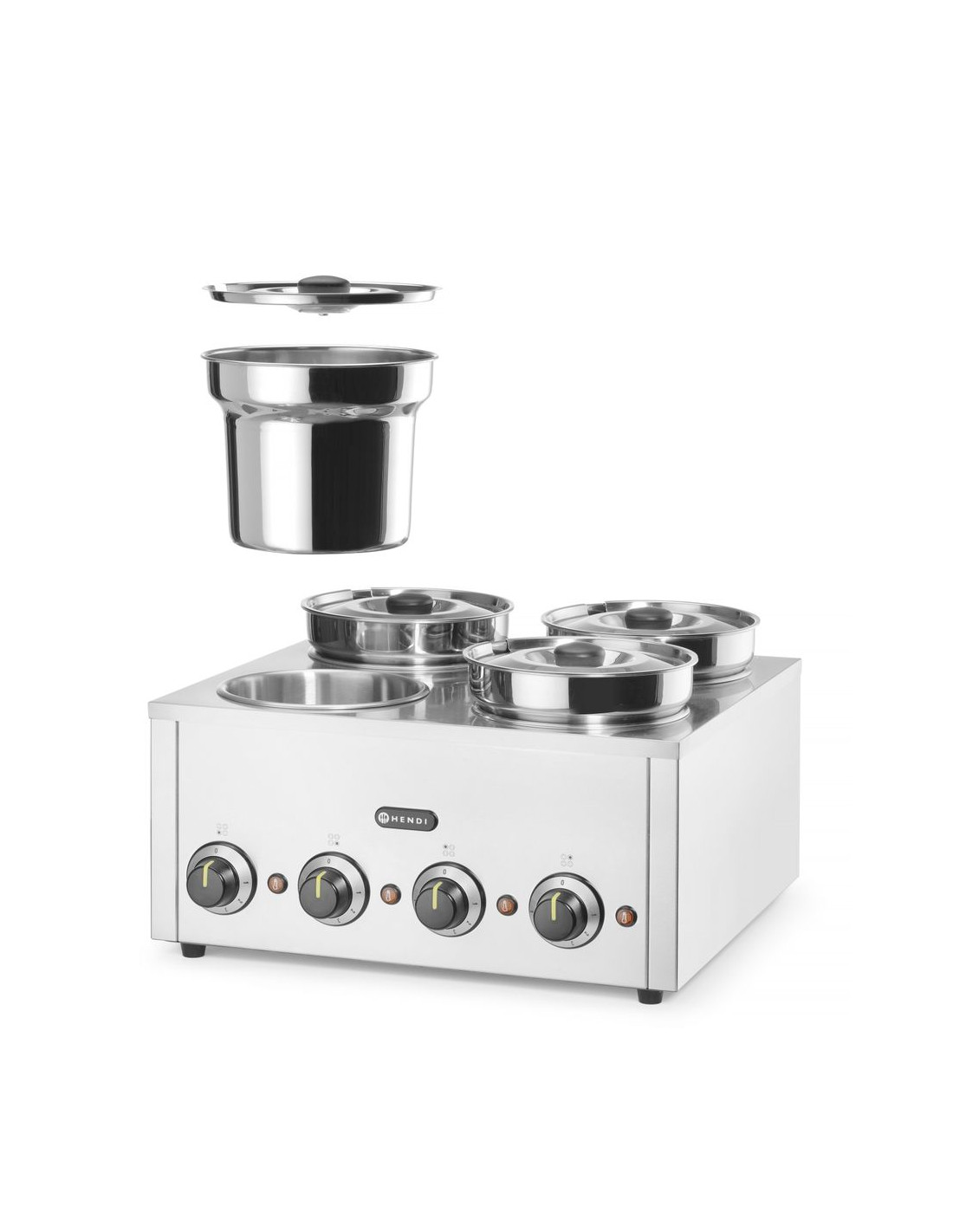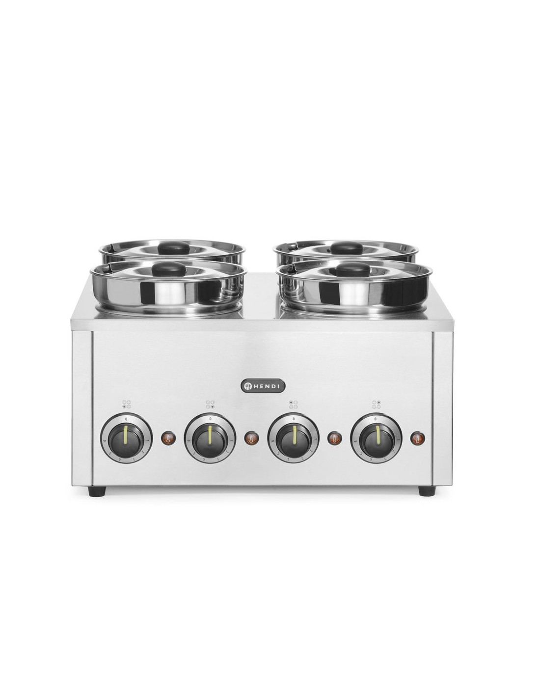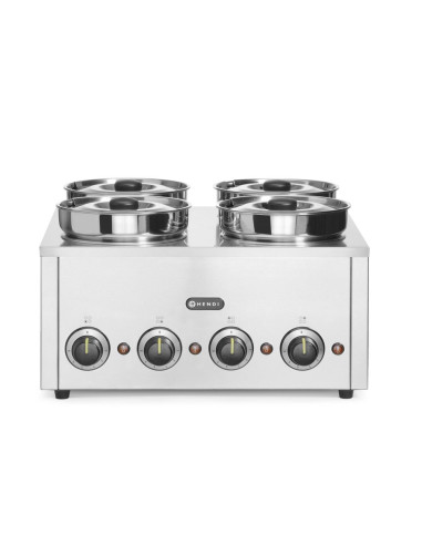 HENDI Thermosystem 4 håller heta såser, soppor och andra livsmedel vid önskad temperatur utan att brännas vid. Temperaturen kan justeras i 6 nivåer beroende på produkt. Den slitstarka konstruktionen har halkfria fötter för att säkerställa stabilitet.