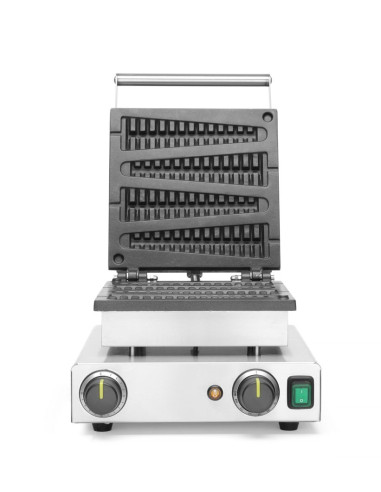 Det är möjligt att baka 4 våfflor samtidigt, vardera 255 mm långa (utan pinne) och formade som en avlång kon. Spår är urskurna ur våffeljärnet så att du kan sätta i pinnen och ändå stänga våffeljärnet. Våffeljärn tillverkade av gjuten aluminium och belagda med en slitstark Teflon® non-stick-beläggning. Öppna våffeljärnet enkelt med det stora handtaget som håller det svalt. Höljet är tillverkat av 18/0 rostfritt stål, vilket garanterar lång livslängd och enkel rengöring. Ventilationsspringor i höljet skyddar reglagen mot överhettning. Temperaturen är steglöst justerbar från 50 °C till 220 °C. Timern kan ställas in på upp till 15 minuter. Nettovikt: 10,5 kg.