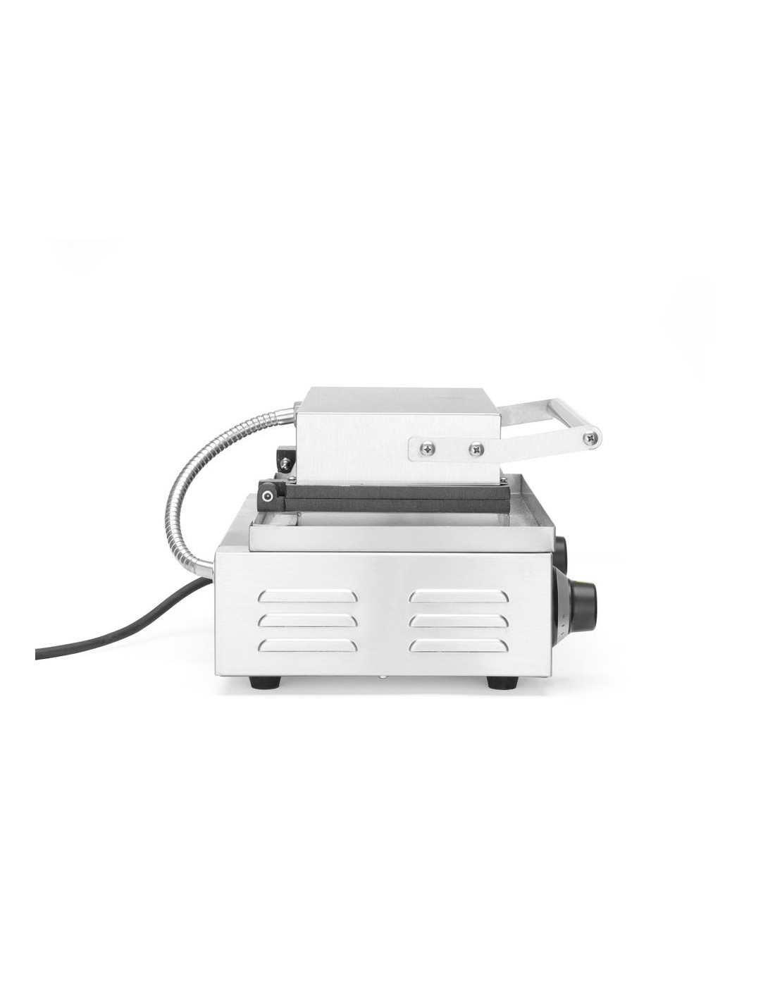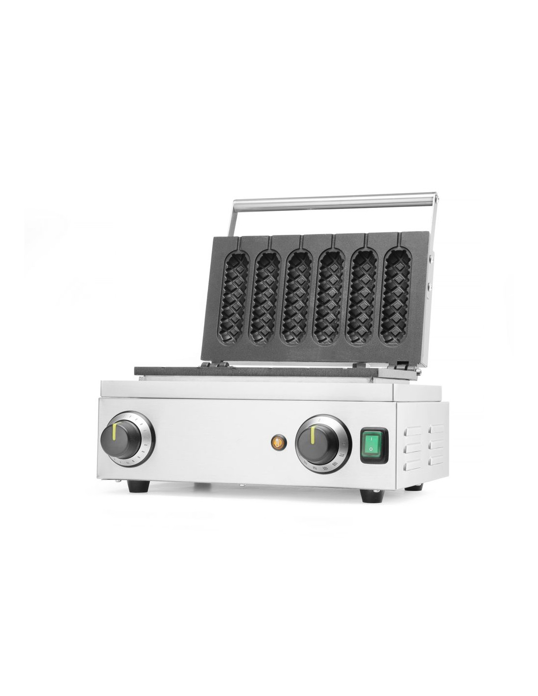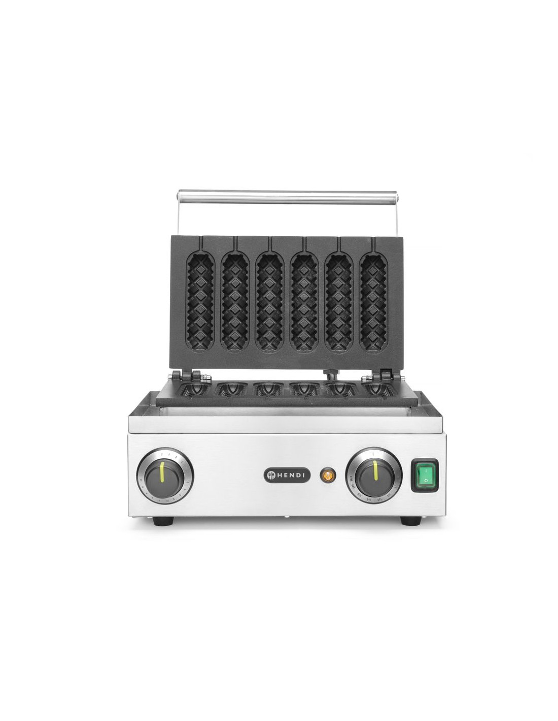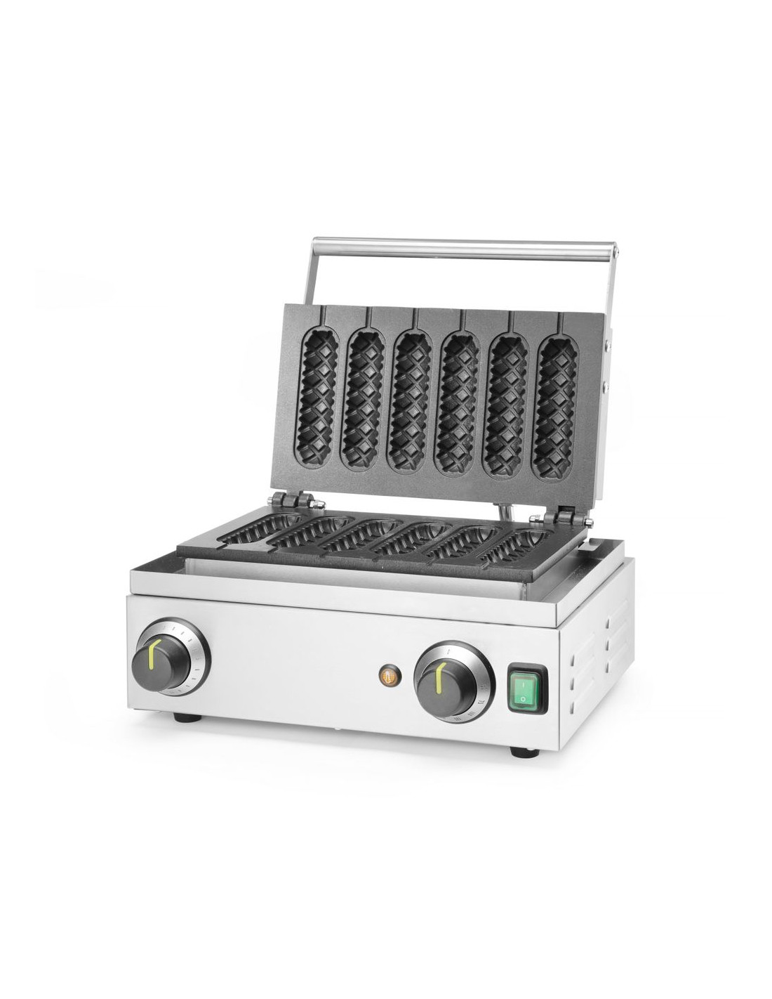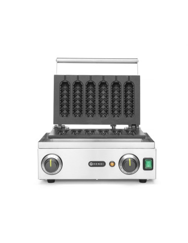 Det är möjligt att grädda 6 våfflor med glass eller majsstjärtar samtidigt. Skåror är urskurna ur våffeljärnet så att du kan sätta i pinnen och ändå stänga våffeljärnet. Våffeljärn tillverkade av gjuten aluminium och belagda med en slitstark Teflon® non-stick-beläggning. Öppna våffeljärnet enkelt med det stora handtaget som håller det svalt. Höljet är tillverkat av 18/0 rostfritt stål, vilket garanterar lång livslängd och enkel rengöring. Utrustad med en droppbricka för deg och fett, hjälper dig att hålla din arbetsyta ren. Ventilationsspringor i höljet skyddar reglagen mot överhettning. Temperaturen är steglöst justerbar från 50 °C till 220 °C. Timern kan ställas in på upp till 15 minuter. Nettovikt: 10 kg.