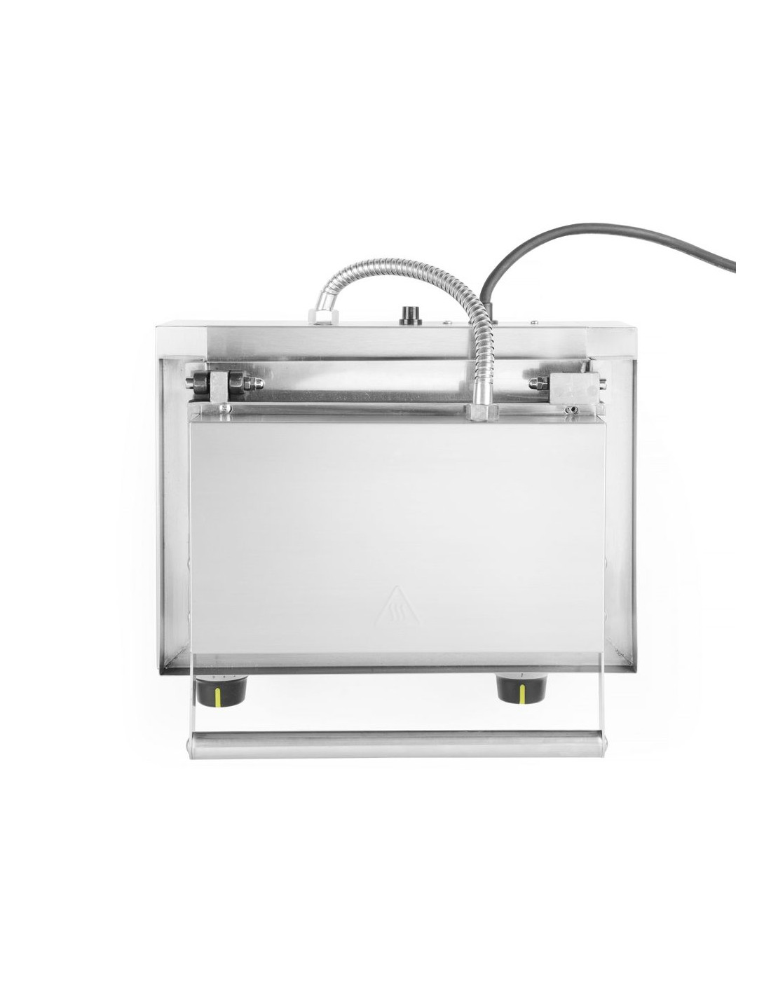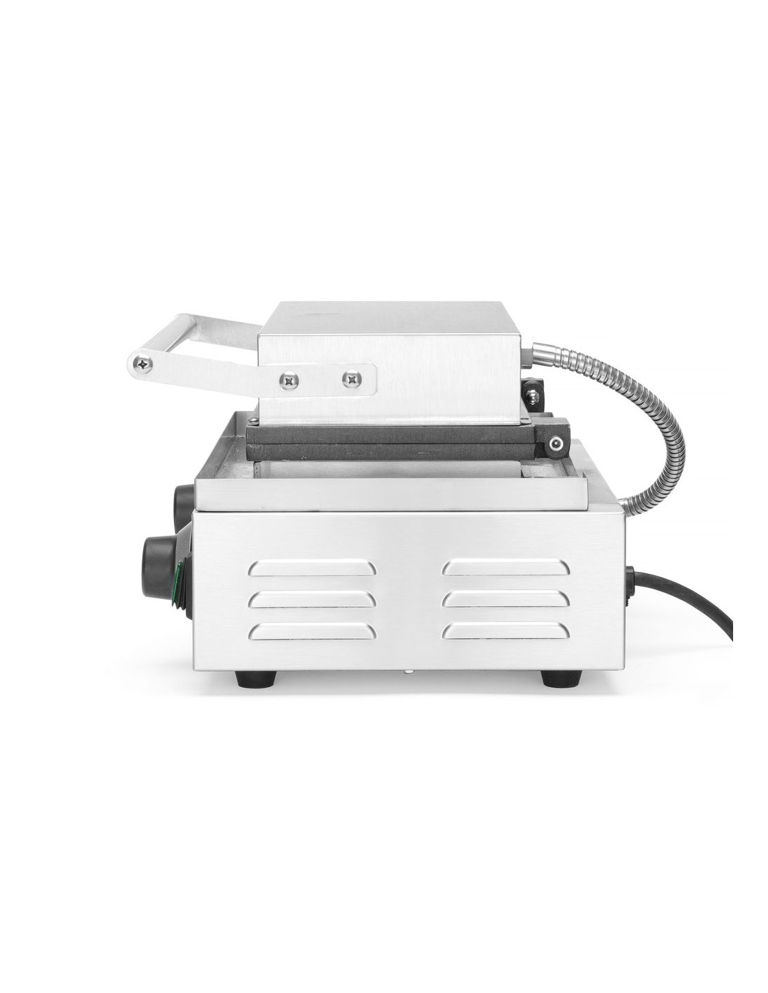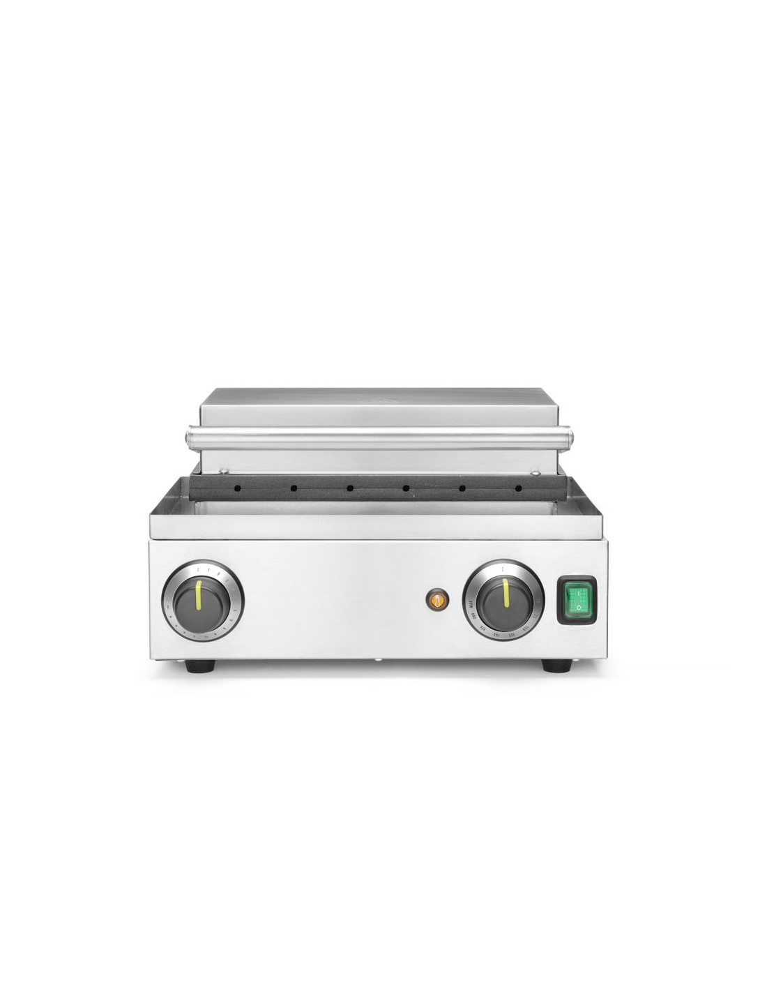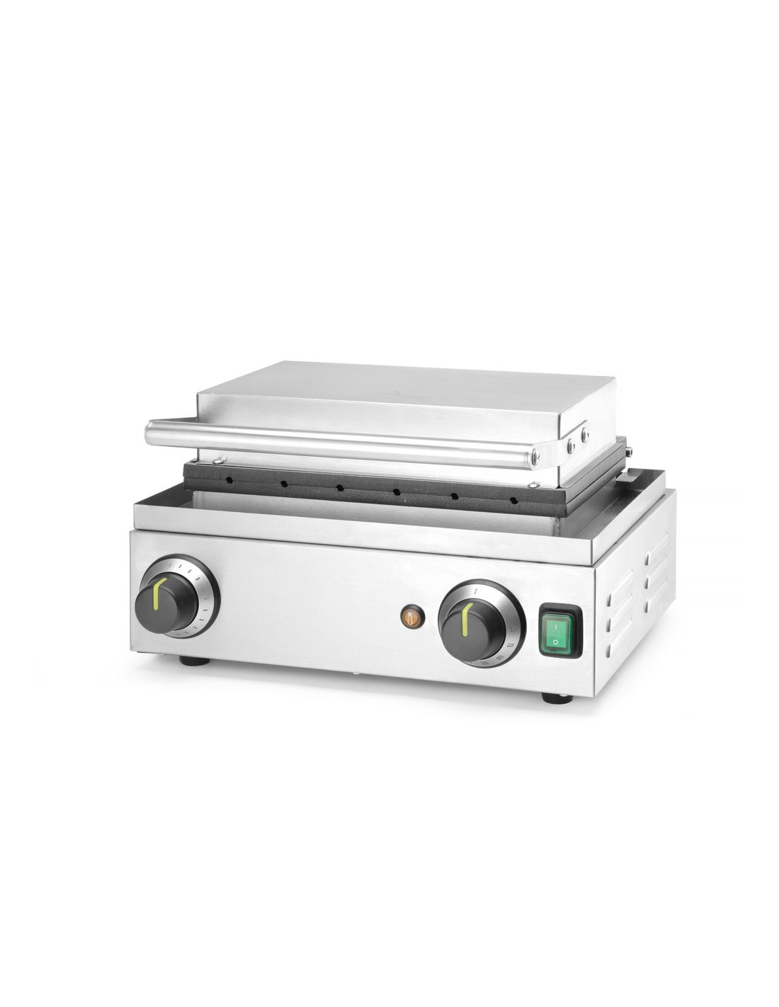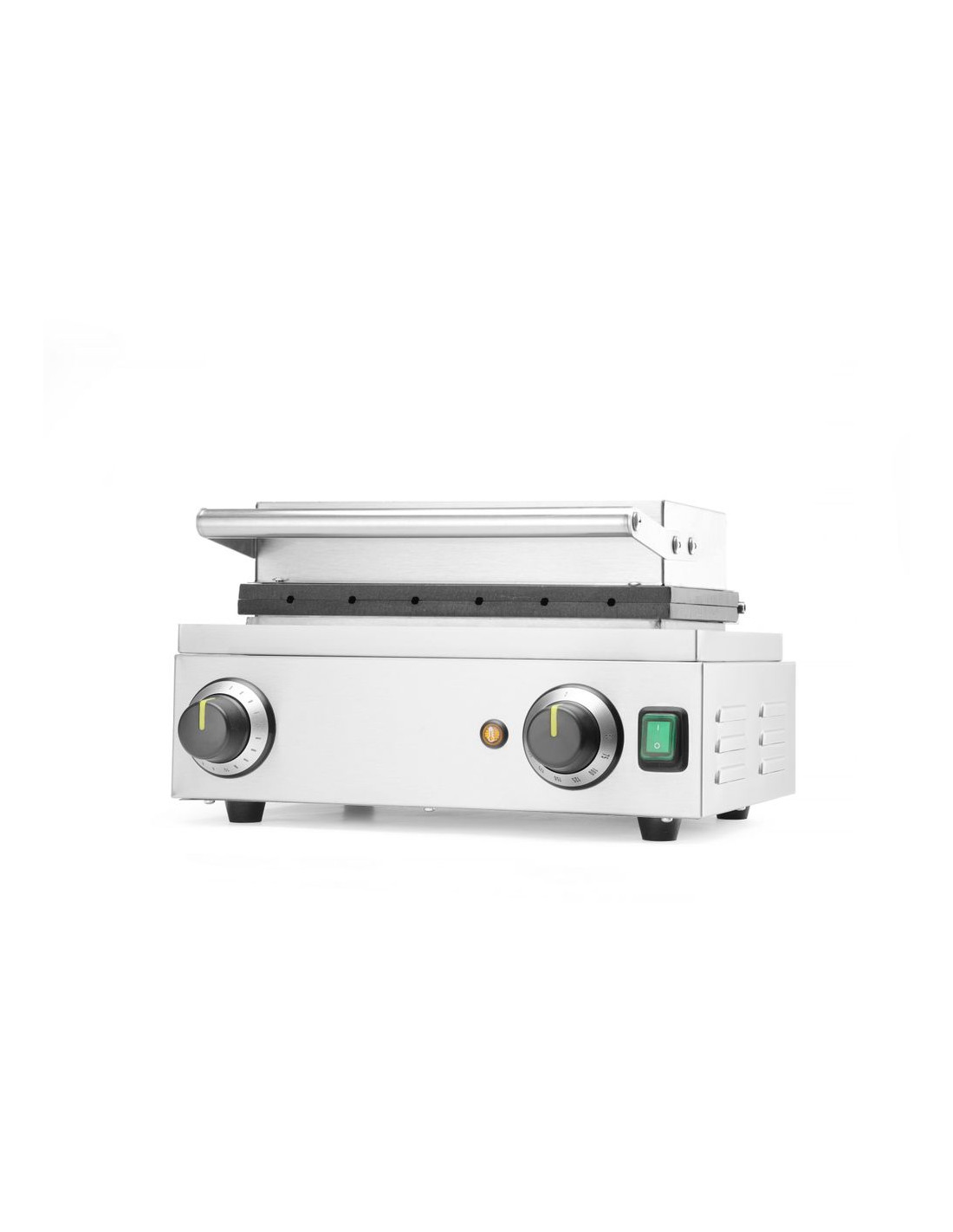 Det är möjligt att grädda 6 våfflor med glass eller majsstjärtar samtidigt. Skåror är urskurna ur våffeljärnet så att du kan sätta i pinnen och ändå stänga våffeljärnet. Våffeljärn tillverkade av gjuten aluminium och belagda med en slitstark Teflon® non-stick-beläggning. Öppna våffeljärnet enkelt med det stora handtaget som håller det svalt. Höljet är tillverkat av 18/0 rostfritt stål, vilket garanterar lång livslängd och enkel rengöring. Utrustad med en droppbricka för deg och fett, hjälper dig att hålla din arbetsyta ren. Ventilationsspringor i höljet skyddar reglagen mot överhettning. Temperaturen är steglöst justerbar från 50 °C till 220 °C. Timern kan ställas in på upp till 15 minuter. Nettovikt: 10 kg.