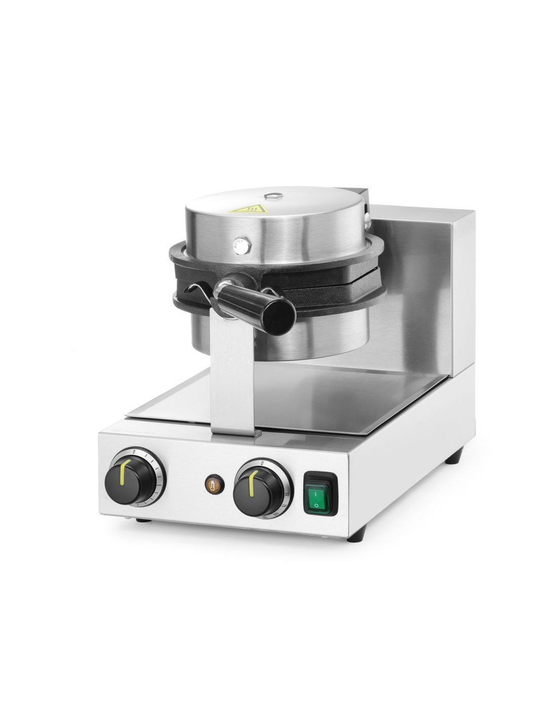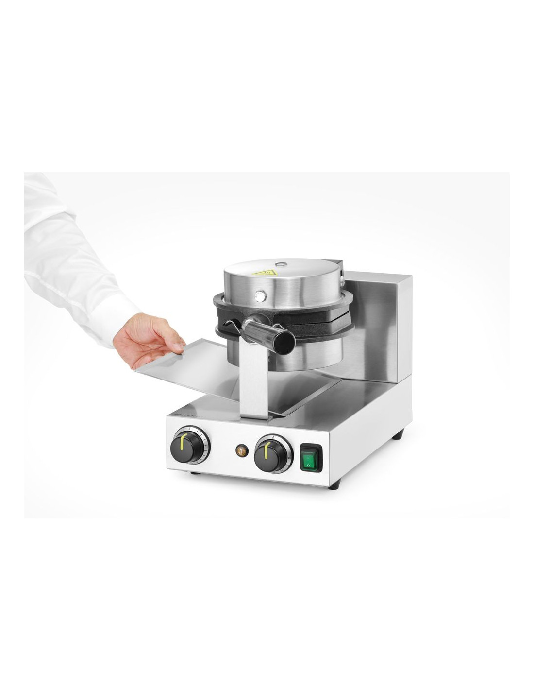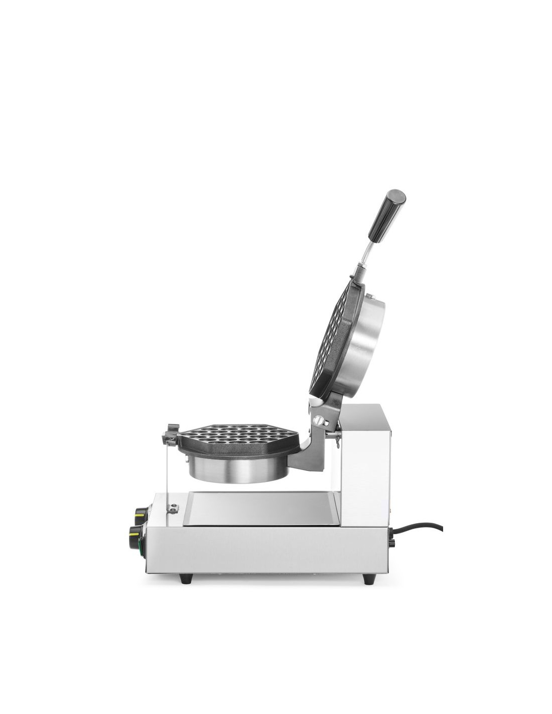 Kropp och lyftspak tillverkade av rostfritt stål. Roterande huvud säkerställer en jämn fördelning av smeten. Tallrikar tillverkade av gjuten aluminium med non-stick teflonbeläggning. LED-lampor som indikerar när inställd temperatur har uppnåtts. Avtagbar droppbricka i rostfritt stål, diskmaskinssäker. Utrustad med överhettningsskydd och ett handtag som håller den sval. Sexkantiga våfflor som mäter 170 mm i diameter och 25 mm tjocka. Temperaturområde: från 50 °C till 210 °C. Utrustad med en 15-minuters timer. Effektivitet: upp till ca 20 våfflor per timme.