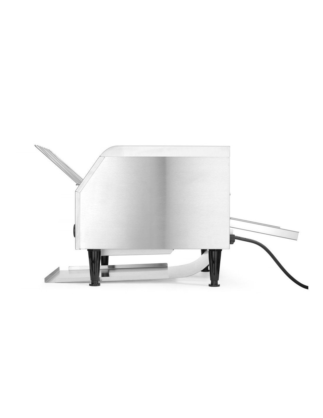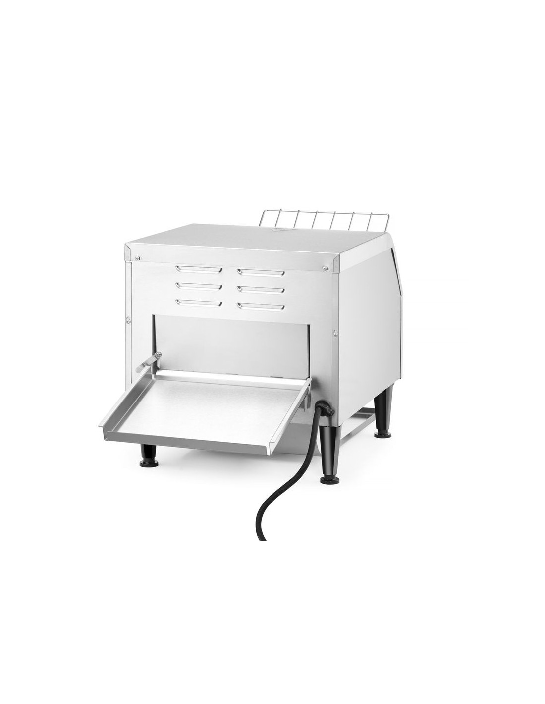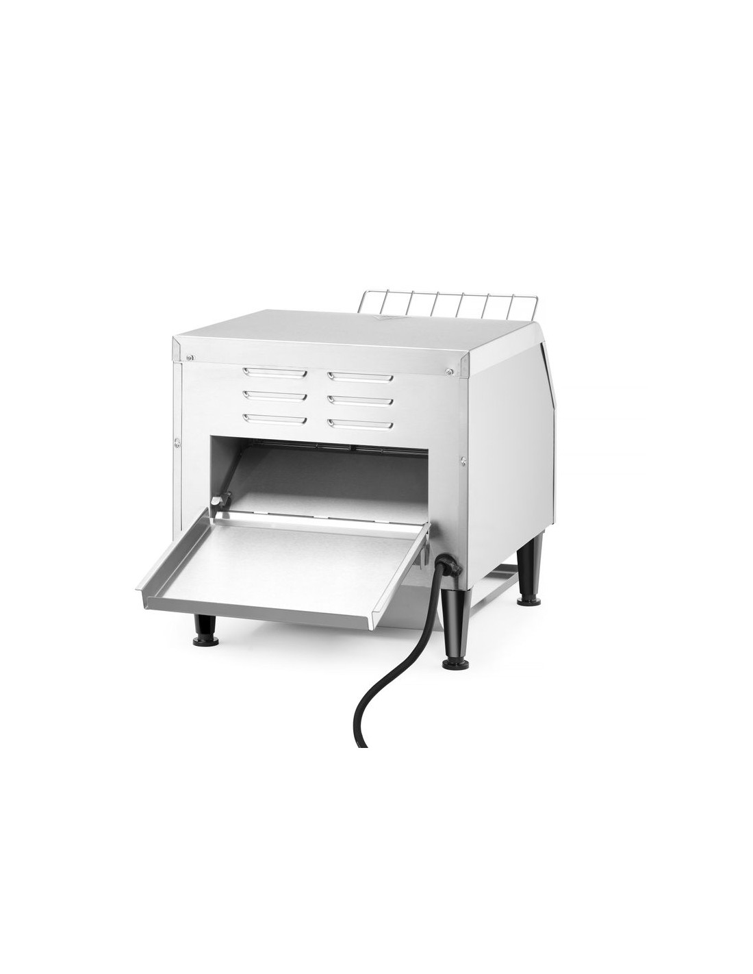 Två rader brödskivor passar bredvid varandra på transportbandet. Två separata värmeelement. Lämplig för kontinuerlig rostning av skivat bröd. Levereras med fram- och bakplåt. Justerbar rostningstid upp till 3 minuter.