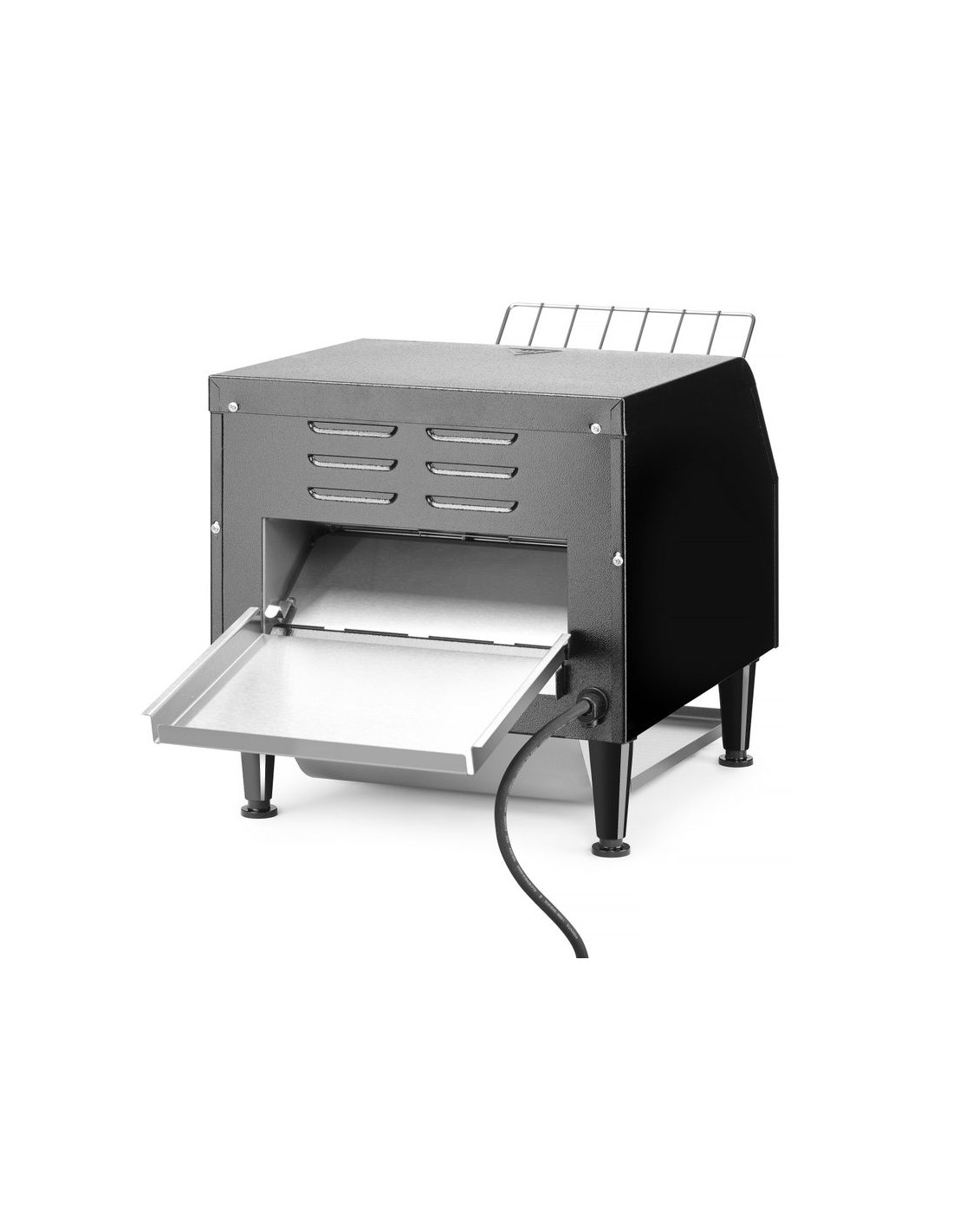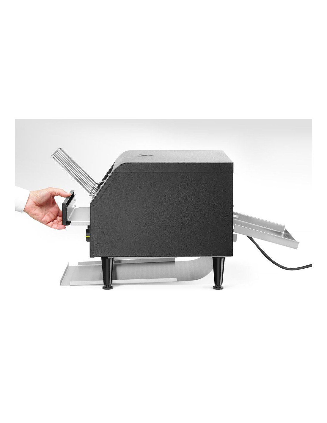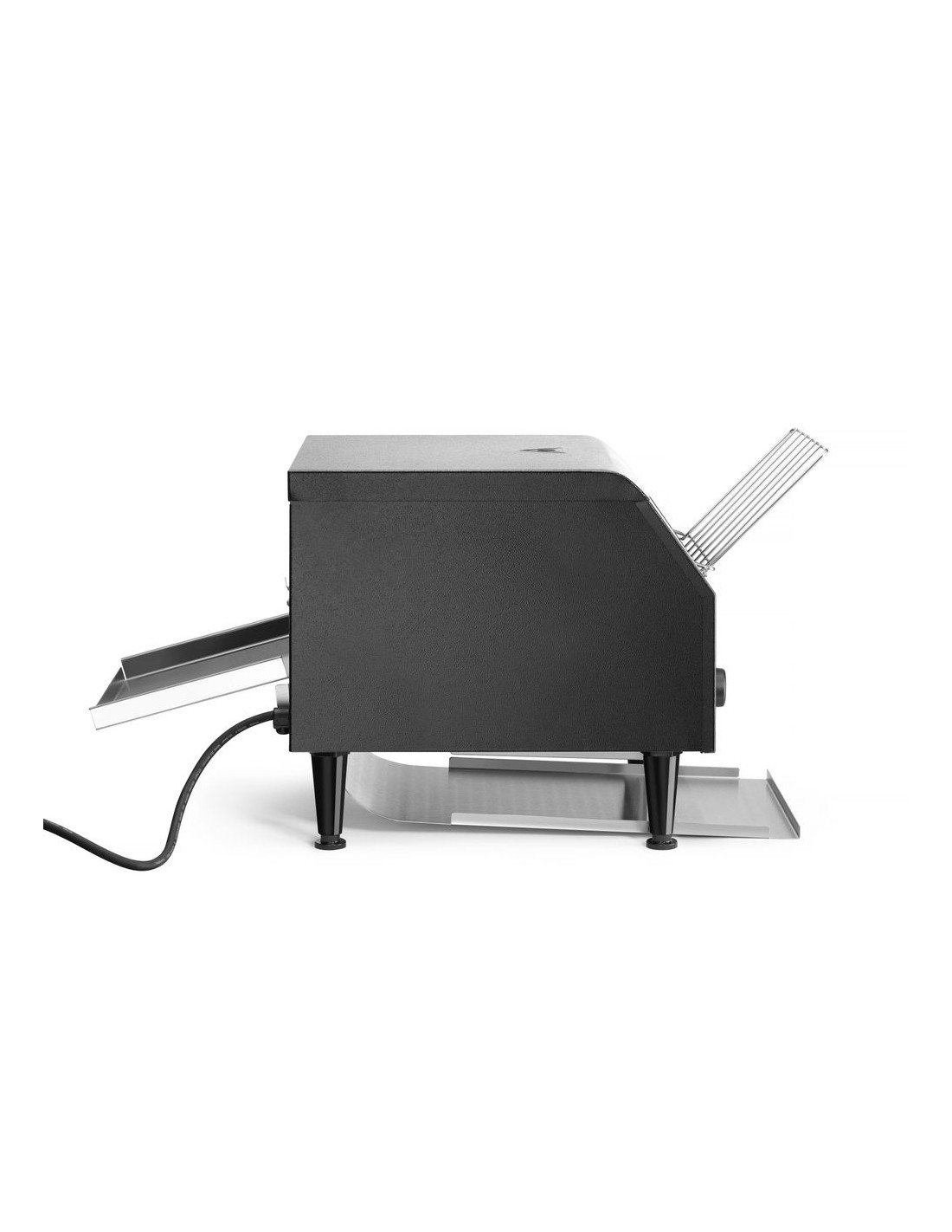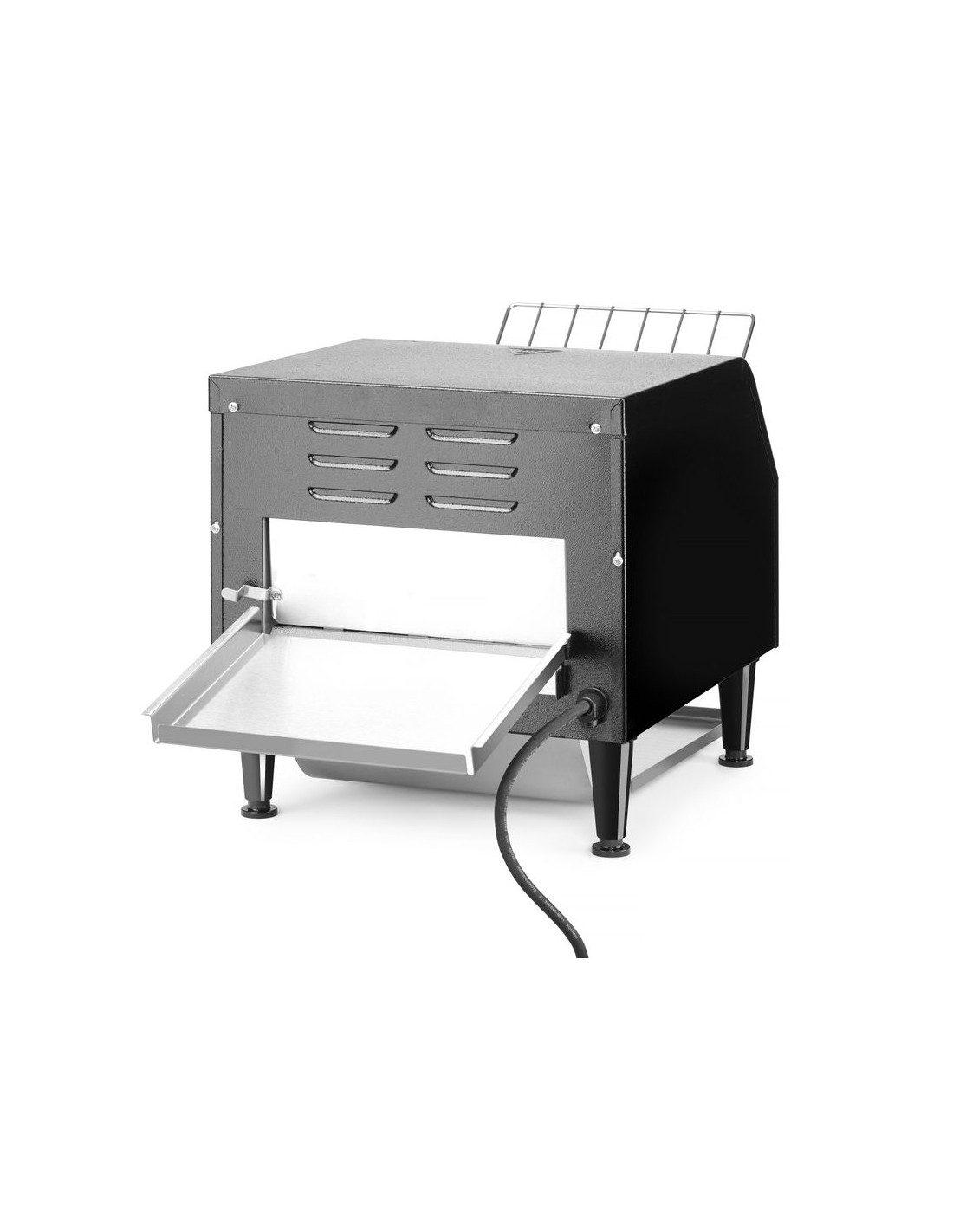 Två rader brödskivor passar bredvid varandra på transportbandet. Två separata värmeelement. Lämplig för kontinuerlig rostning av skivat bröd. Levereras med fram- och bakplåt. Justerbar rostningstid upp till 3 minuter.