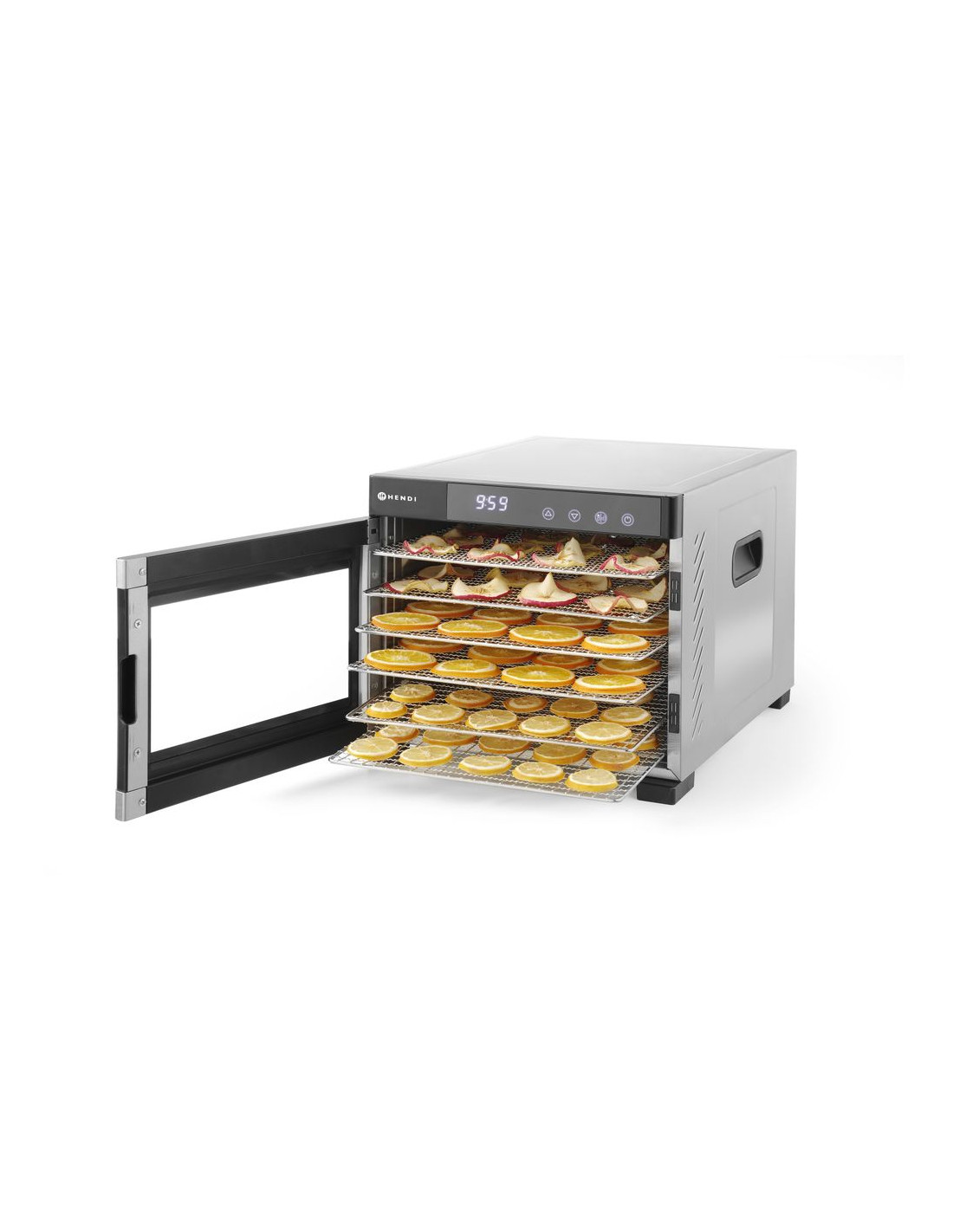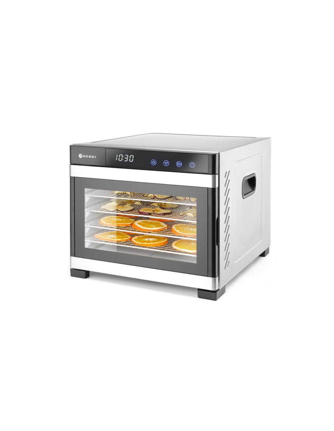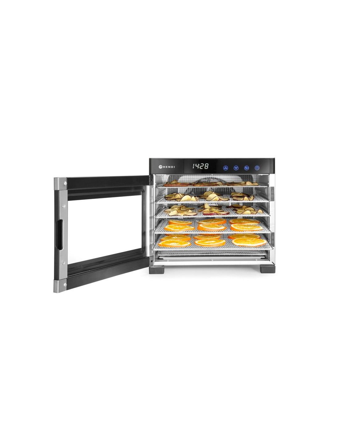 HENDI livsmedelstork kombinerar hållbar konstruktion i rostfritt stål med exakta digitala kontroller för att säkerställa jämn och effektiv torkning. Med en tyst fläkt som cirkulerar varm luft jämnt i hela kammaren elimineras behovet av att rotera brickor under drift. Enheten har 6 avtagbara, lättrengjorda galler i rostfritt stål och en transparent dörr för bekväm övervakning.