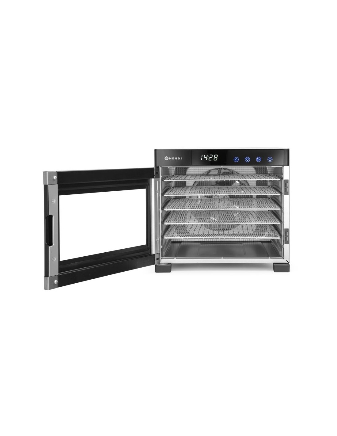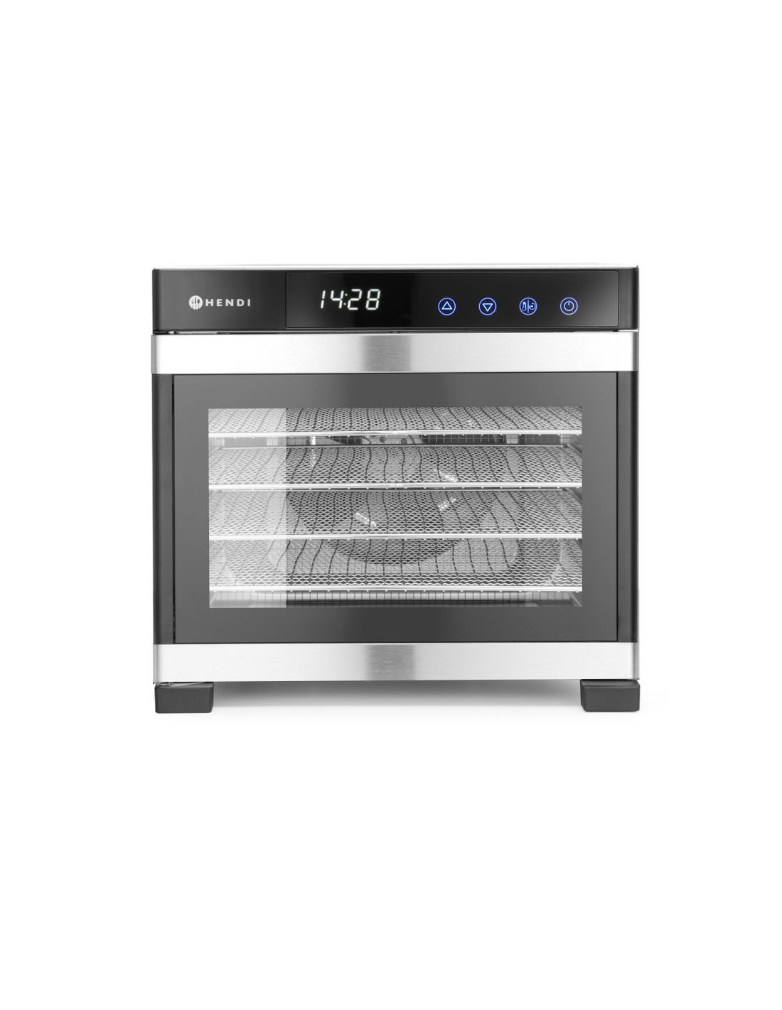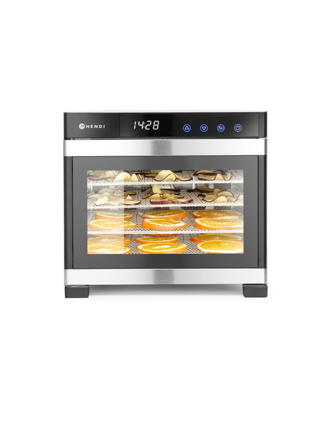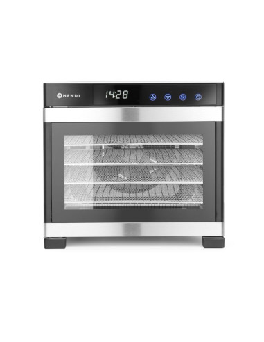HENDI livsmedelstork kombinerar hållbar konstruktion i rostfritt stål med exakta digitala kontroller för att säkerställa jämn och effektiv torkning. Med en tyst fläkt som cirkulerar varm luft jämnt i hela kammaren elimineras behovet av att rotera brickor under drift. Enheten har 6 avtagbara, lättrengjorda galler i rostfritt stål och en transparent dörr för bekväm övervakning.