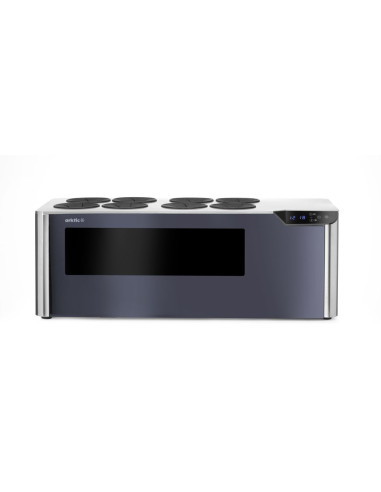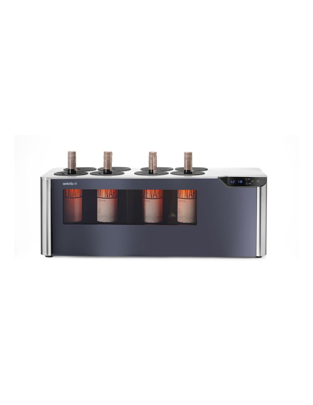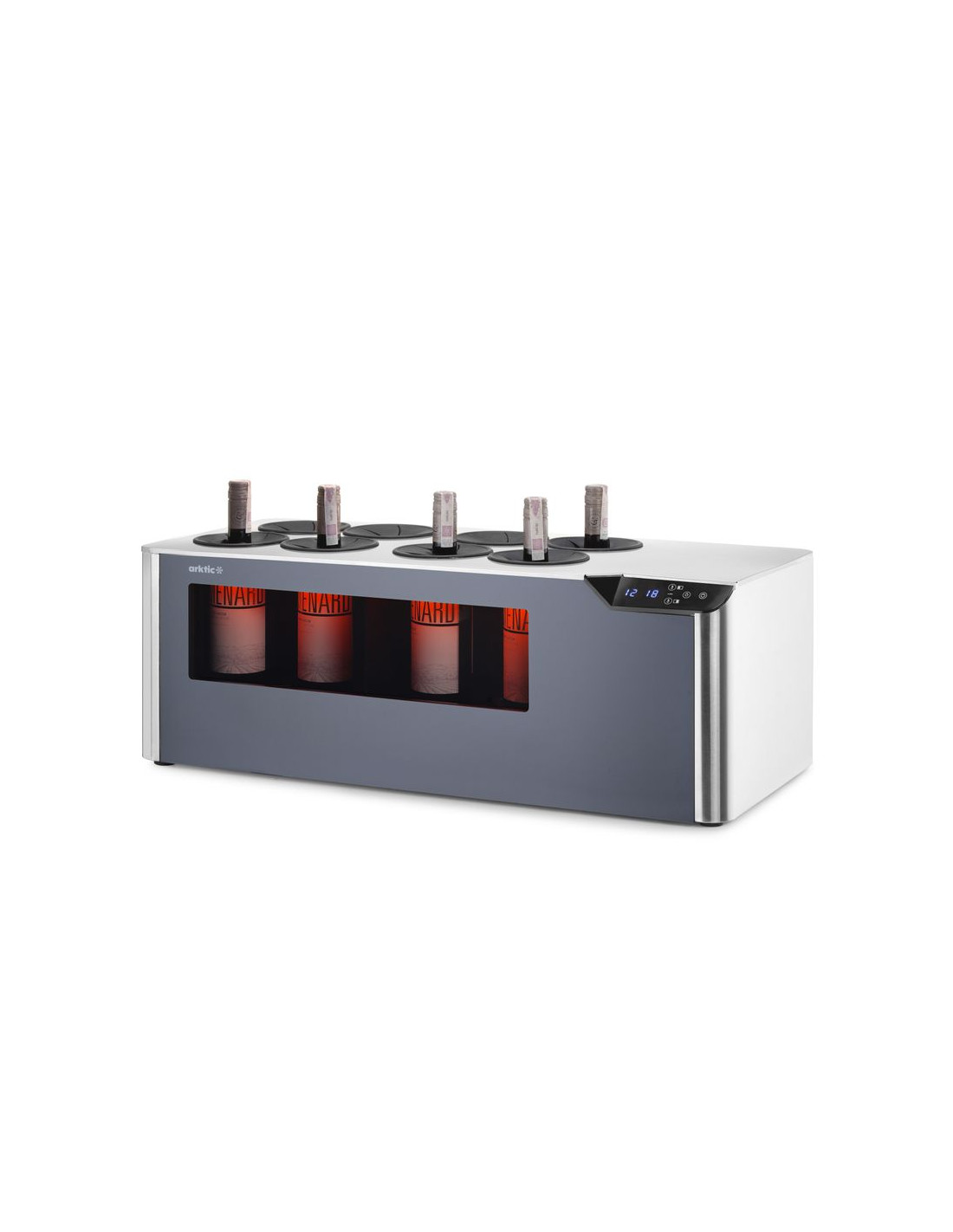 Arktic Countertop vinkylare, 2-zons Cellar, erbjuder en sömlös blandning av stil och funktion för barer, boutiquehotell, provsmakningsrum och fina restauranger. Dess kompressorteknik kyler inte bara utan justerar även temperaturen om vinet behöver värmas, vilket bibehåller ideala förhållanden året runt. Dess kompakta design rymmer 8 flaskor, och den eleganta pekskärmen med anpassningsbar LED-belysning (vit, bärnstensfärgad eller kallblå) höjer estetiken och gör vindisplayen till en del av gästupplevelsen.