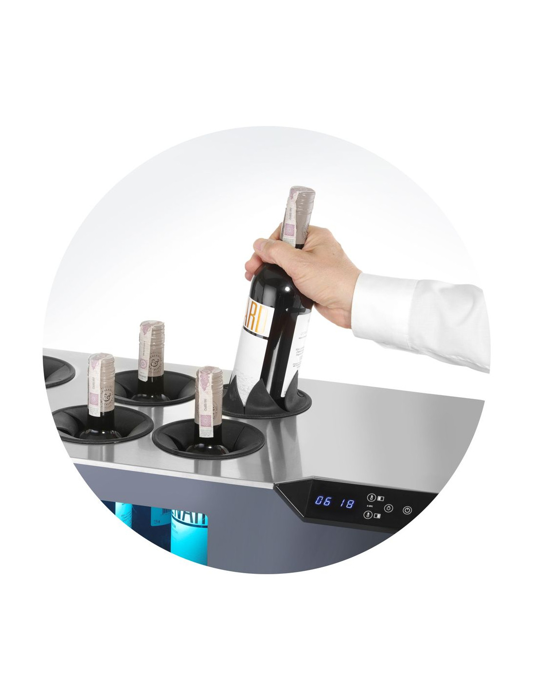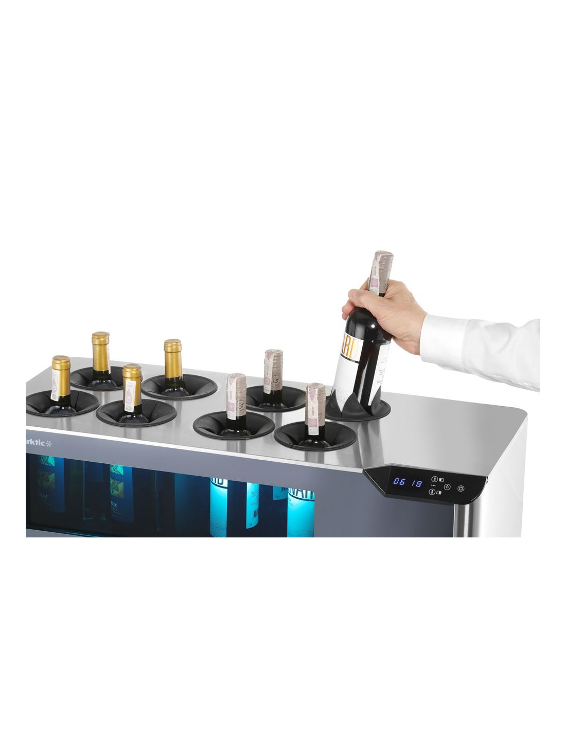 Hölje av rostfritt stål. Vinkyl med dubbla zoner. Med pekskärmskontroll. Oberoende justerbara zoner (3°C–18°C) håller röda och vita viner vid rätt serveringstemperatur. LED-lampor inuti kammaren (3 färger att välja mellan: vit, bärnstensfärgad, kallblå). Kapacitet för upp till 8 flaskor. Kan användas för både öppna och stängda flaskor. Säkerställer jämn vintemperatur.