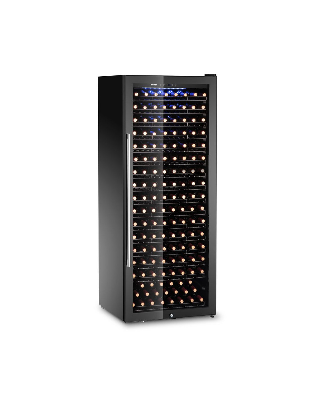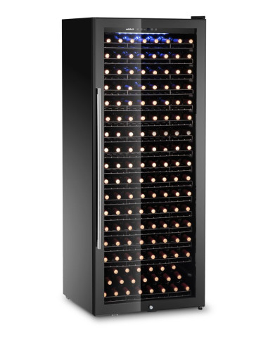Utrustad med en enda kylzon med justerbar temperatur från 5 °C till 22 °C. Skåpet är tillverkat av stål med svart pulverlackering. Har svarta kromhyllor som möjliggör flexibel stapling av flaskor. Perfekt för långvarig vinförvaring under optimala temperaturförhållanden. Ramlös dörr i härdat glas med ett robust handtag i rostfritt stål. Dörren har ett lås med nyckel för extra säkerhet. Fläktassisterad statisk kylning säkerställer jämn temperaturfördelning. Automatisk avfrostningsfunktion för bekvämlighet och lågt underhållsbehov. Digital display och elektronisk termostat för exakt temperaturkontroll. Total kapacitet: upp till 300 flaskor (542 liter). Energiklass: G (skala A–G). 4 justerbara, halkfria fötter för stabil installation. Köldmedium: R600a.